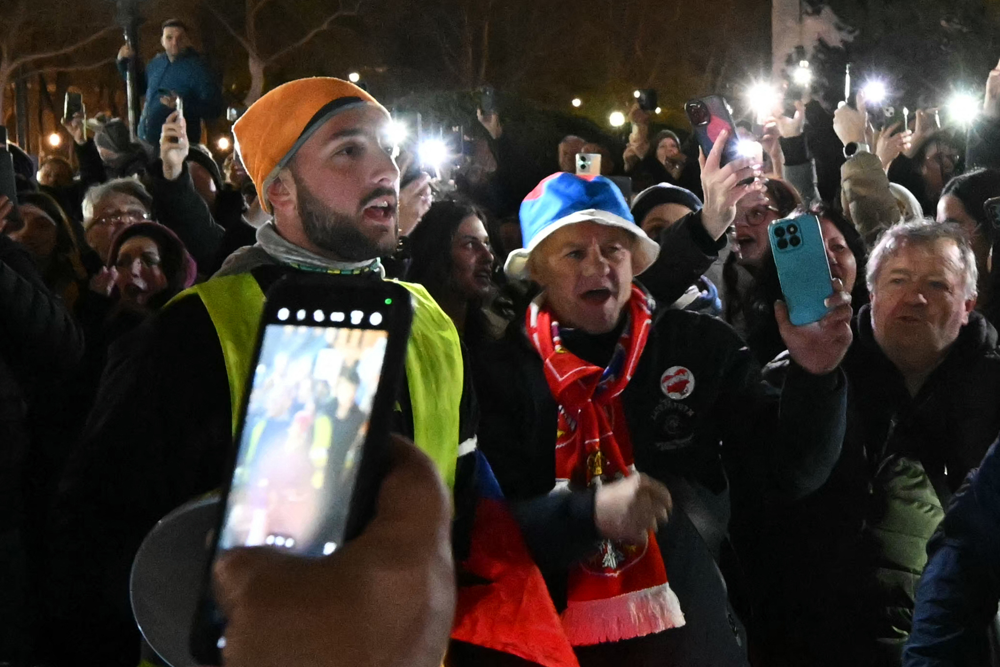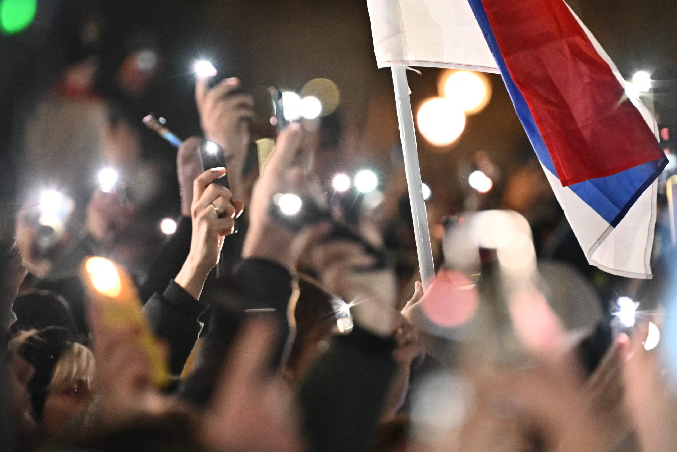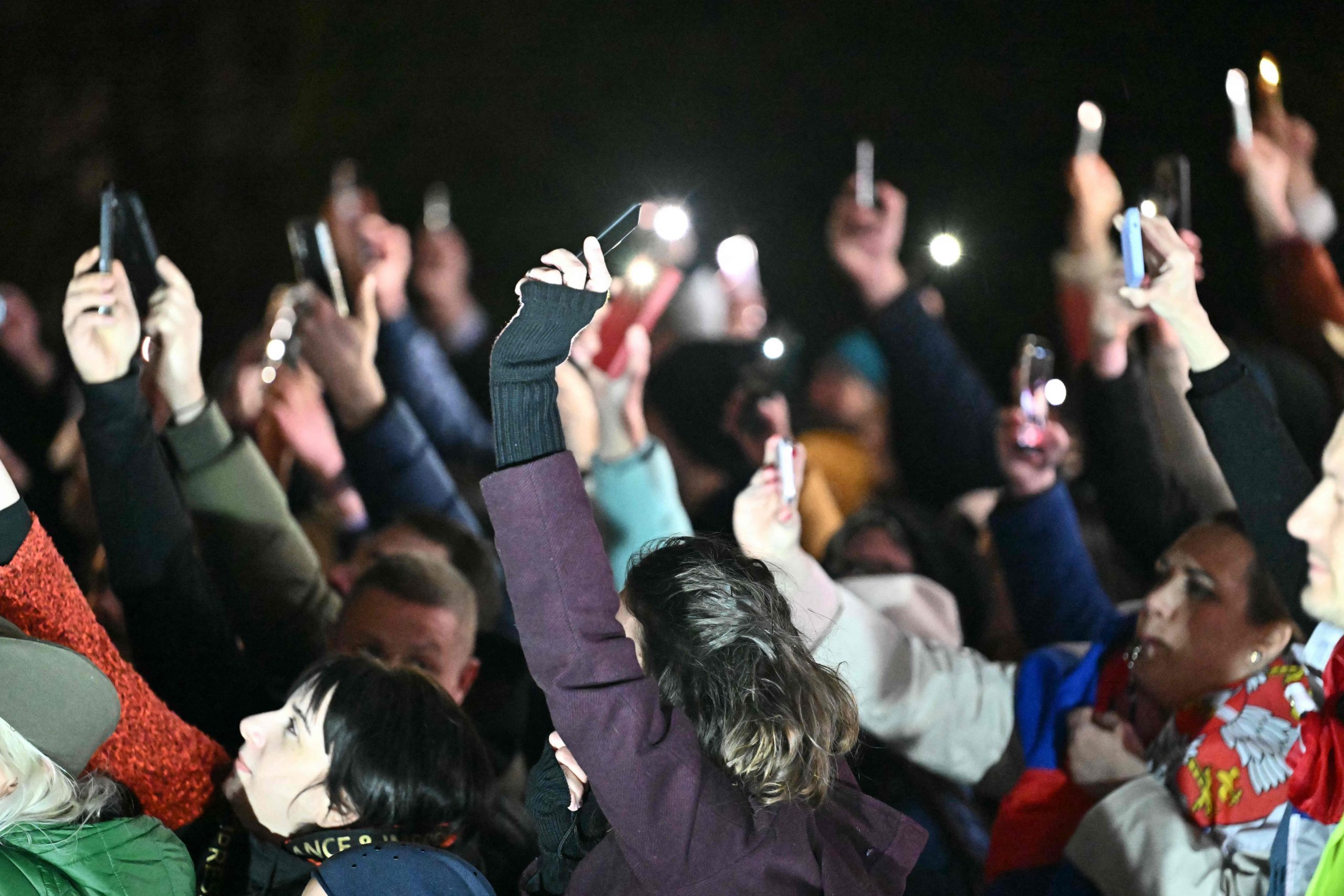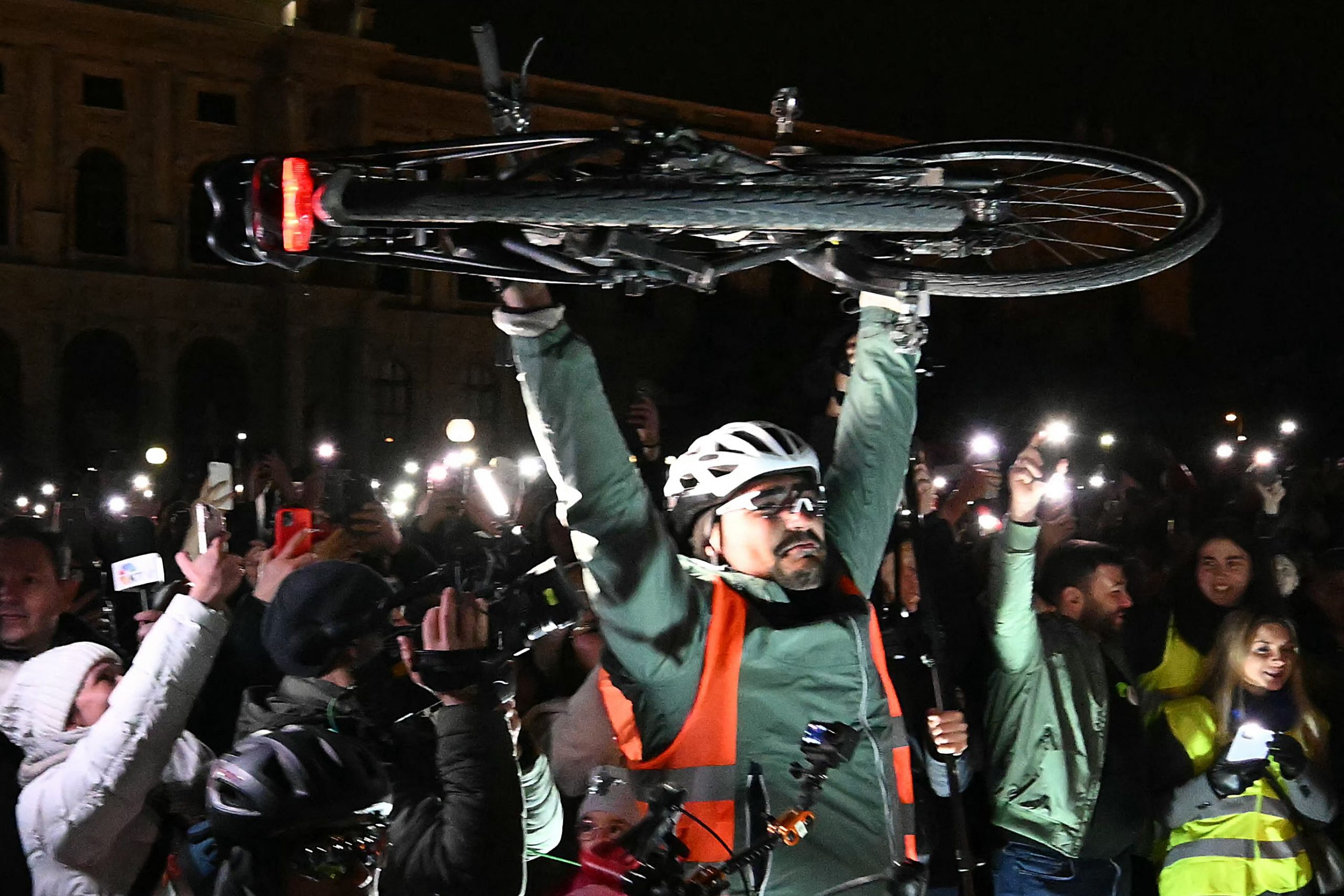 Trotz der verspäteten Ankunft herrschte am Maria-Theresien-Platz ausgelassene Stimmung. Serbische Musik tönte aus den Lautsprechern, auf dem roten Teppich wurde getanzt. Als die Gruppe eintraf, ertönten "Pumpaj"-Rufe – der Schlachtruf der Bewegung – begleitet von einem Meer aus Handyscheinwerfern. Manche Radler trugen serbische Fahnen, eine Ikone oder ein Pikachu-Kuscheltier.