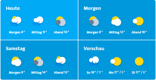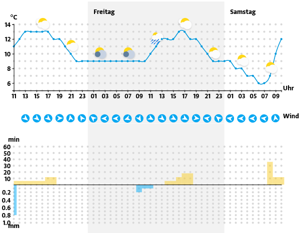- Höchstwerte: 8 bis 13 Grad.