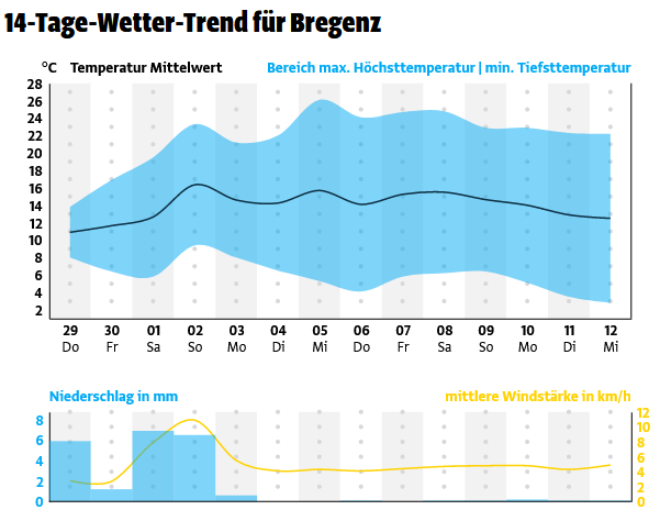 - Höchstwerte: 8 bis 14 Grad.