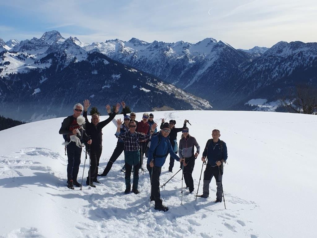 Schon bei der Autobahnausfahrt Nenzing, Blickrichtung Walserkamm kamen bereits einige Zweifel hoch, ob dies mit den Schneeschuhen wohl klappen würde. Oberhalb von St.Gerold am Wanderparkplatz angekommen sah man anstatt der erhofften weisen Pracht nur braune Hügel. Frischer Schnee und Schneeschuhe waren Wunschdenken. Aber die Sonne schien vom blauen Himmel und los ging´s mit “Schuhisele” bewaffnet in Richtung Alpe Plansott. Die Alpe war nicht weit genug und so ging es hinauf bis zum nächsten Gipfel. Dort konnte man deutlich die Abrisse von Lawinen an den Berghängen sehen. Zurück zur Alpe freuten sich alle in der Sonne die mitgebrachten Köstlichkeiten zu verzerren. Nach ca. einer Stunde Pause machten sich alle wieder auf den Nachhauseweg. Immer noch nicht genug von der Sonne wurde auf einer herrlichen Terrasse nochmals eine Pause eingelegt um nochmals 5% Bräunung zu erhaschen.