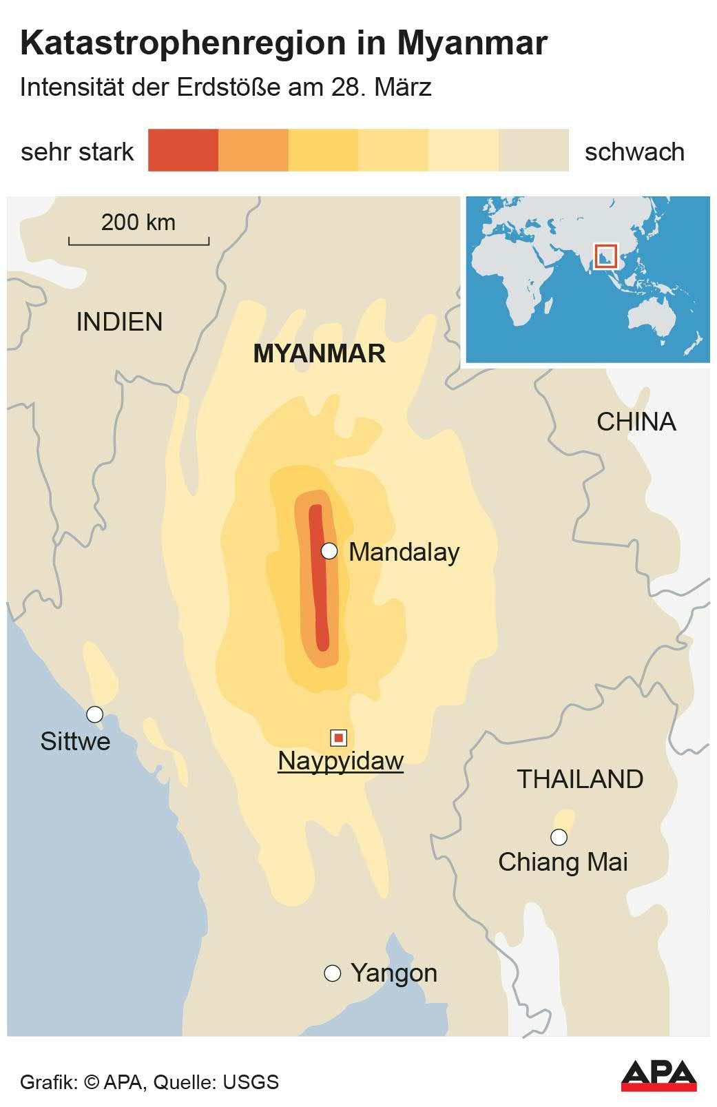 Im ehemaligen Burma stürzten als Folge der heftigen Erdstöße unter anderem eine Moschee und ein Kloster ein. Das Rote Kreuz in Myanmar sprach von verheerenden Schäden. Es bestehe große Sorge, dass Dämme am Fluss Irrawaddy beschädigt worden sein und brechen könnten. Seit einem Militärputsch im Februar 2021 versinkt das Land ohnehin schon in Gewalt und Chaos, verschiedene Rebellengruppen kämpfen teils erfolgreich gegen die Armee. Aus dem Land dringen nur wenige Informationen nach außen.