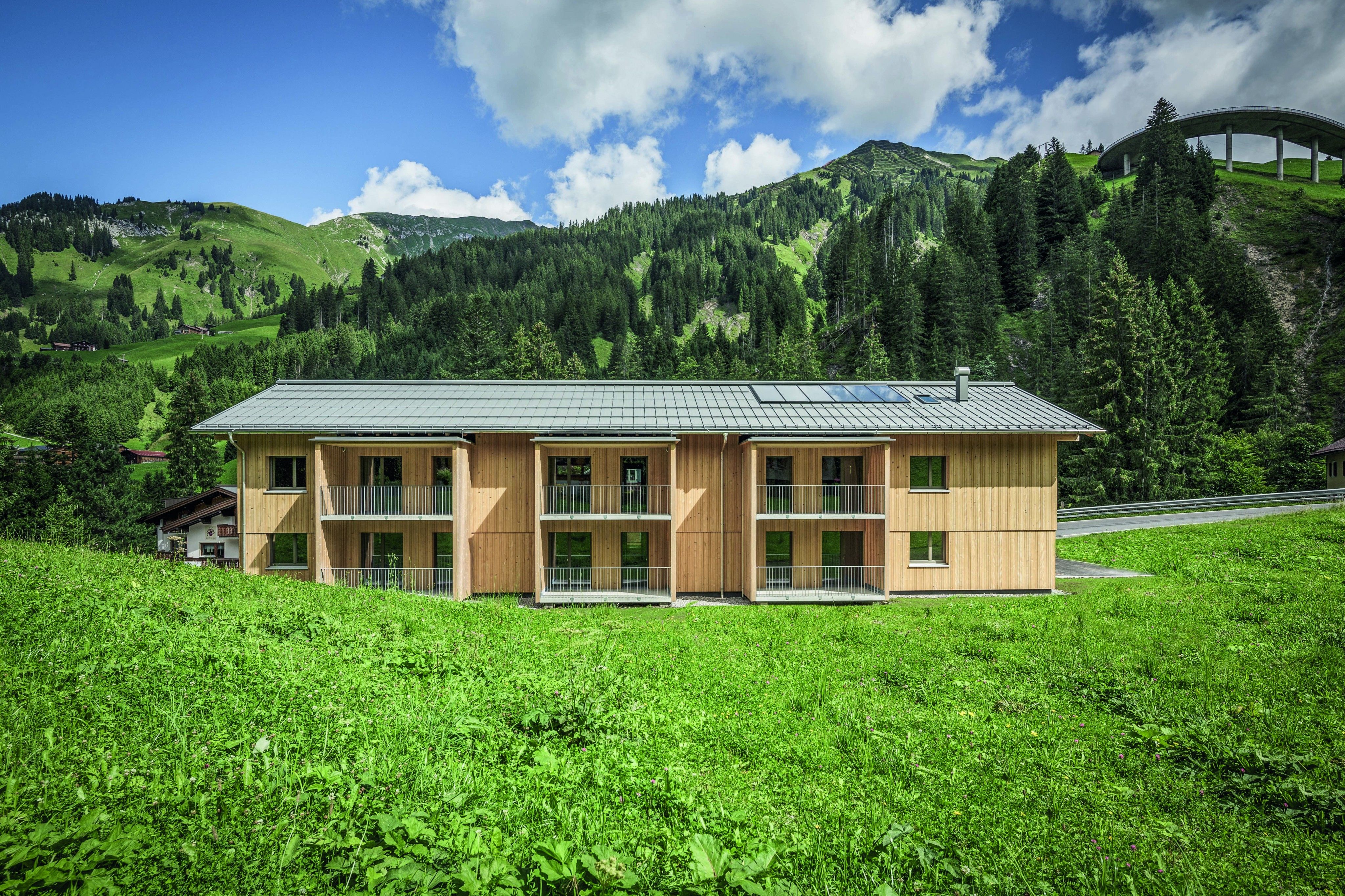 Auch in der Gemeinde Schröcken kam das erfolgserprobte Modell WOHNEN500 zum Einsatz, jedoch nicht wie bisher als Punkthaus, sondern mit Satteldach, Personenaufzug und unterschiedlichen Wohnungstypen (Wohnen500+)Vorteile sind Barrierefreiheit in allen Stockwerken und Tiefgaragenstellplätze. Die 2-, 3- und 4-Zimmer Wohnungen sind nach Süden orientiert, geben den Blick auf die Berge frei und bieten ihren Bewohnern eine gemütliche Wohlfühlatmosphäre. Dieses Projekt ist ein zukunftsorientierter Lösungsansatz, um trotz steigender Baupreise auch in einer hoch gelegenen Berggemeinde bezahlbaren und hochwertigen Wohnraum anbieten zu können.