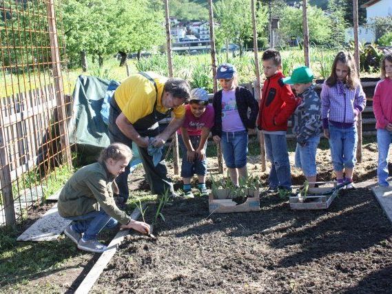 Die Maispflanzen wurden von den Schülern der 1c und 2a Klasse der VS Nüziders und deren Lehrpersonen (Patricia Müller sowie Rainer Bitschnau) in der Klasse hervorragend betreut und es war höchste Zeit sie ins Freie zu setzen. Am Dienstag, den 14.05.2013 fand daher bei wunderschönem Wetter das Einpflanzen der stattlich gewachsenen Maispflänzchen statt. Projektleiter Franz Meyer, der das Beet vorbereitet hatte, zeigte den Schülern das Einpflanzen vor. Anschließend durfte jeder Schüler ein Pflänzchen einsetzen. Nach der Arbeit erwartete die Schüler Süßmost sowie Rhabarberkuchen, der regen Absatz fand. Der nächste Termin wird noch vor Schulende sein. Da nämlich besuchen die Lehrpersonen und Schüler das Maisfeld erneut. Die Pflanzen sind dann hoffentlich ca. 70 bis 100 cm hoch gewachsen. Man darf gespannt sein und auf gutes Wetter hoffen.