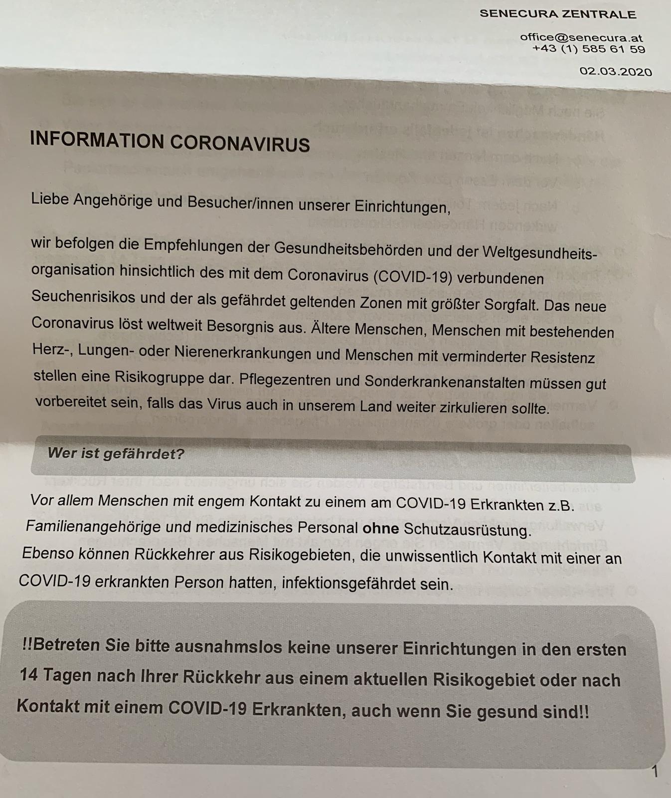 Das Privatunternehmen Senecura hat nun eigene Vorsichtsmaßnahmen in folge des Convid-19 aufgestellt. Diese wurden an die Angehörigen der in den Senecura Pflegeeinrichtungen untergebrachten Personen ausgehändigt.