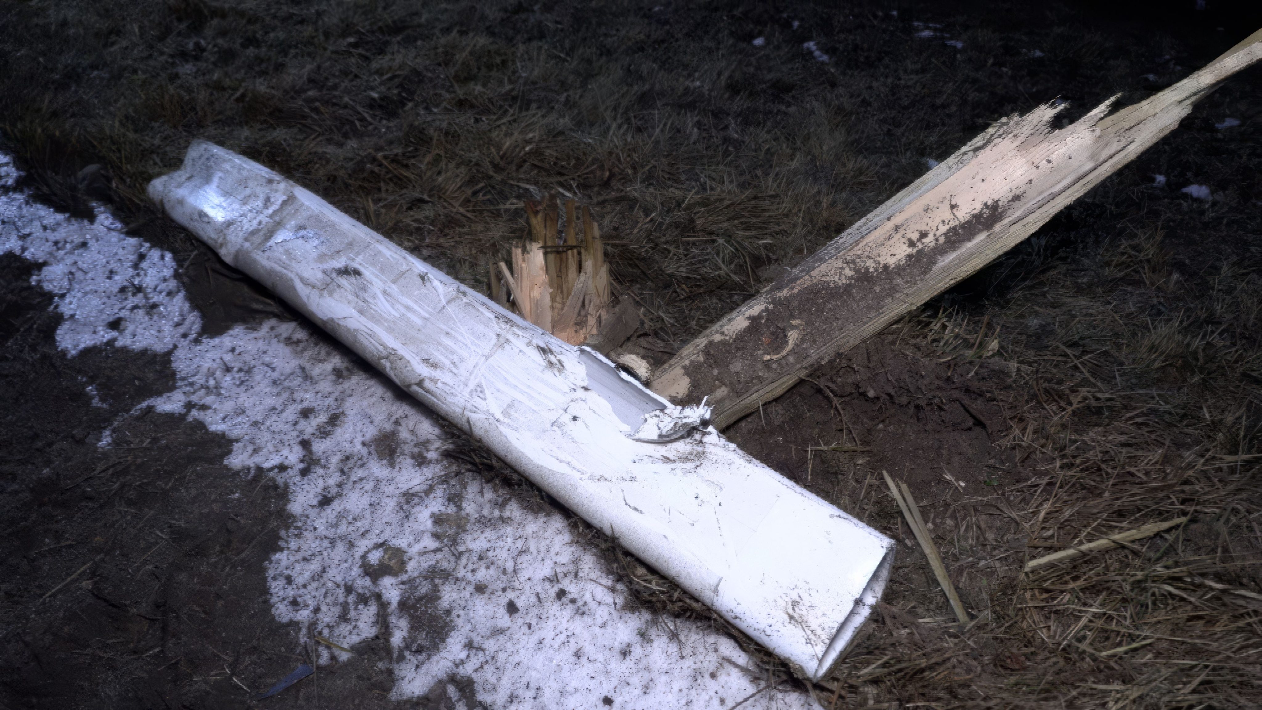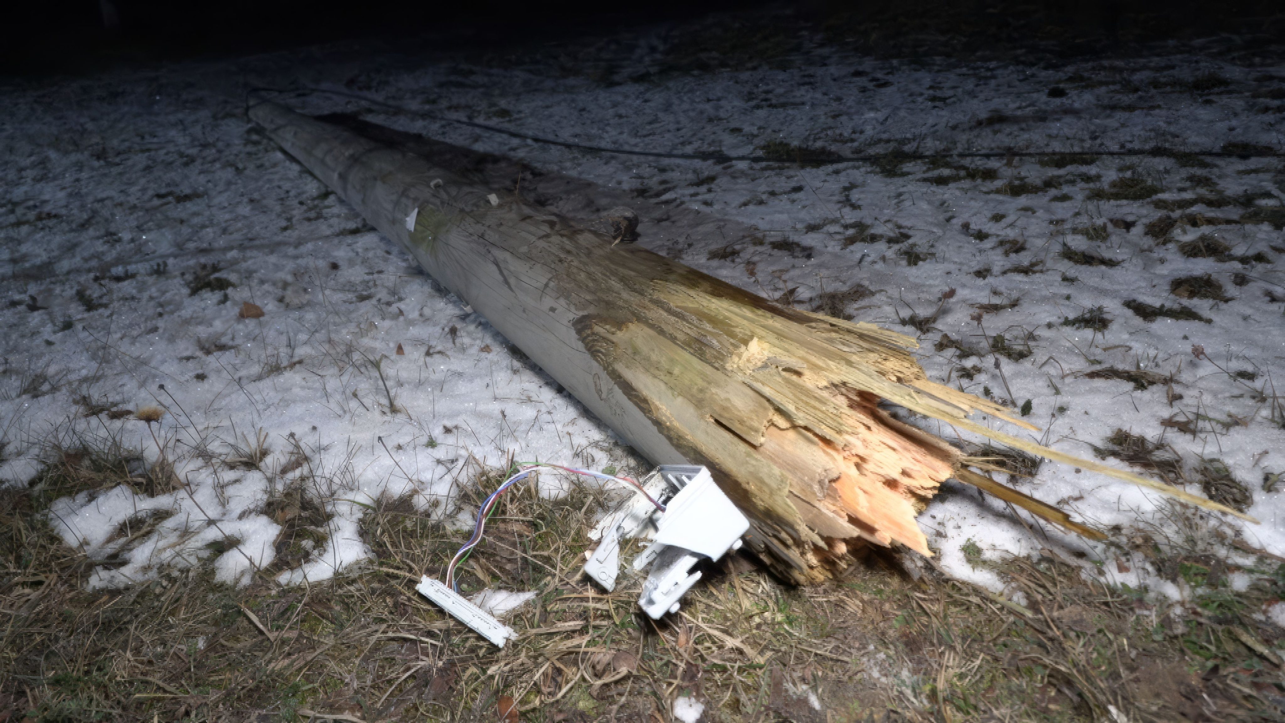 Das Fahrzeug prallte mit hoher Wucht gegen einen Leitungsmast, der aus der Verankerung gerissen und in eine angrenzende Wiese geschleudert wurde.