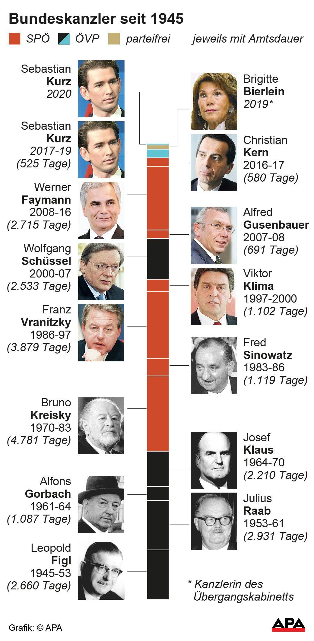 Kreiskys Parteikollege Christian Kern landete mit Kurz' erster Angelobung als Chef der türkis-blauen Koalition am 18. Dezember 2017 am anderen Ende der Tabelle: Mit nur rund eineinhalb Jahren war er der Kanzler, der sich am kürzesten im Amt halten konnte. Diesen Titel trug vorübergehend Kurz, als er am 28. Mai 2019 nach dem Misstrauensvotum des Nationalrates - angesichts der "Ibiza-Affäre" - des Amtes enthoben wurde: Denn da war er erst 525 Tage im Amt.