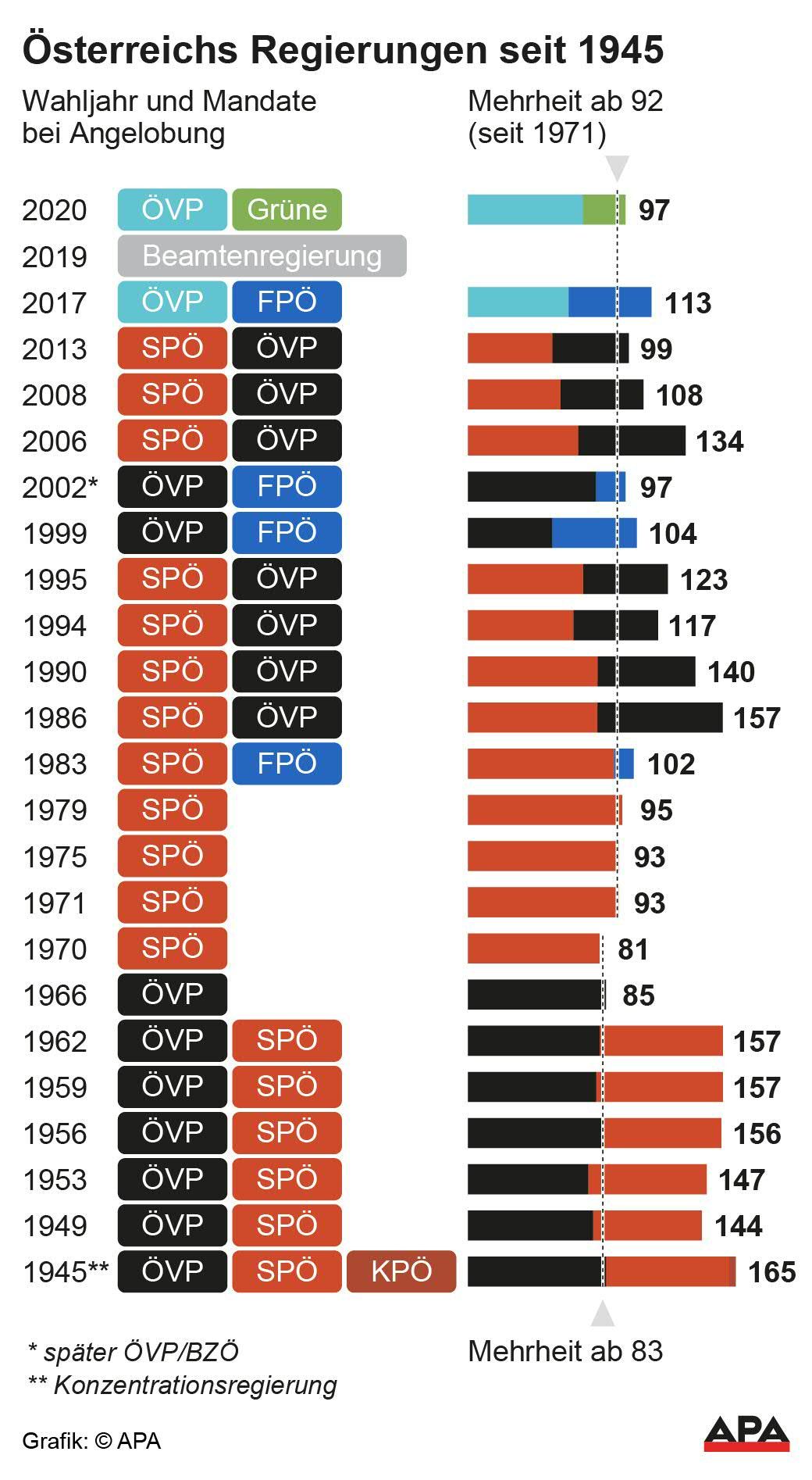 Am 24. April 1983 ging die 13-jährige Phase der SPÖ-Alleinregierungen mit dem Verlust der Absoluten zu Ende. Seither wird Österreich von Koalitionen regiert. Dominiert hat in diesen Jahren die Große Koalition von SPÖ und ÖVP. Aber sie wurde von Periode zu Periode weniger beliebt - und so kommt jetzt nach dem erneuten Scheitern einer ÖVP-FPÖ-Regierung das erste Mal Türkis-Grün an die Macht.