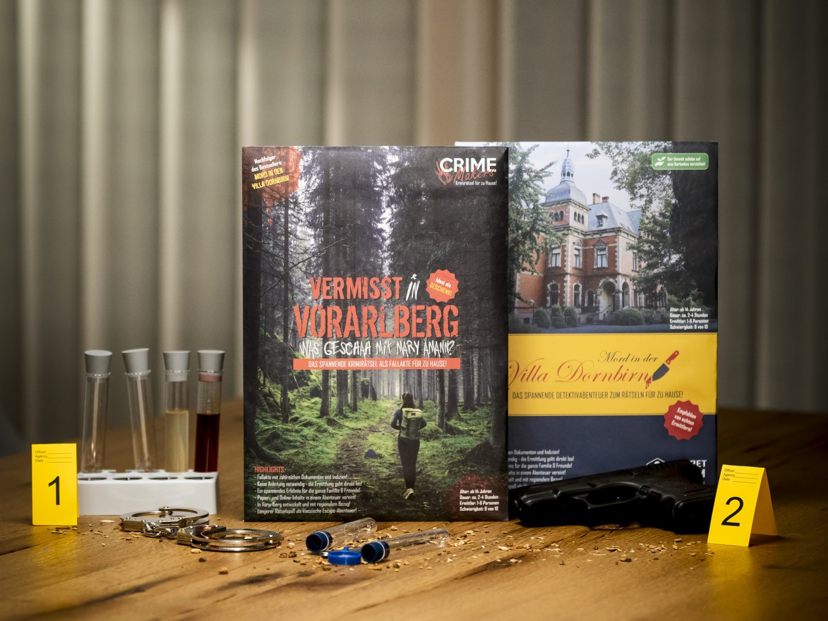 Sichere dir jetzt mit ein bisschen Glück das ultraspannende Krimi Package, bestehend aus "Mord in der Villa Dornbirn" und "Vermisst in Vorarlberg"! Highlights der Spiele sind unter anderem der Bezug zu Vorarlbergs größter Stadt und zahlreichen lokalen Unternehmen sowie die Verbindung zwischen den 35 Papierunterlagen und verschiedenen Webinhalten, welche es zu einem multimedialen Abenteuer für die ganze Familie macht - lasst euch überraschen.