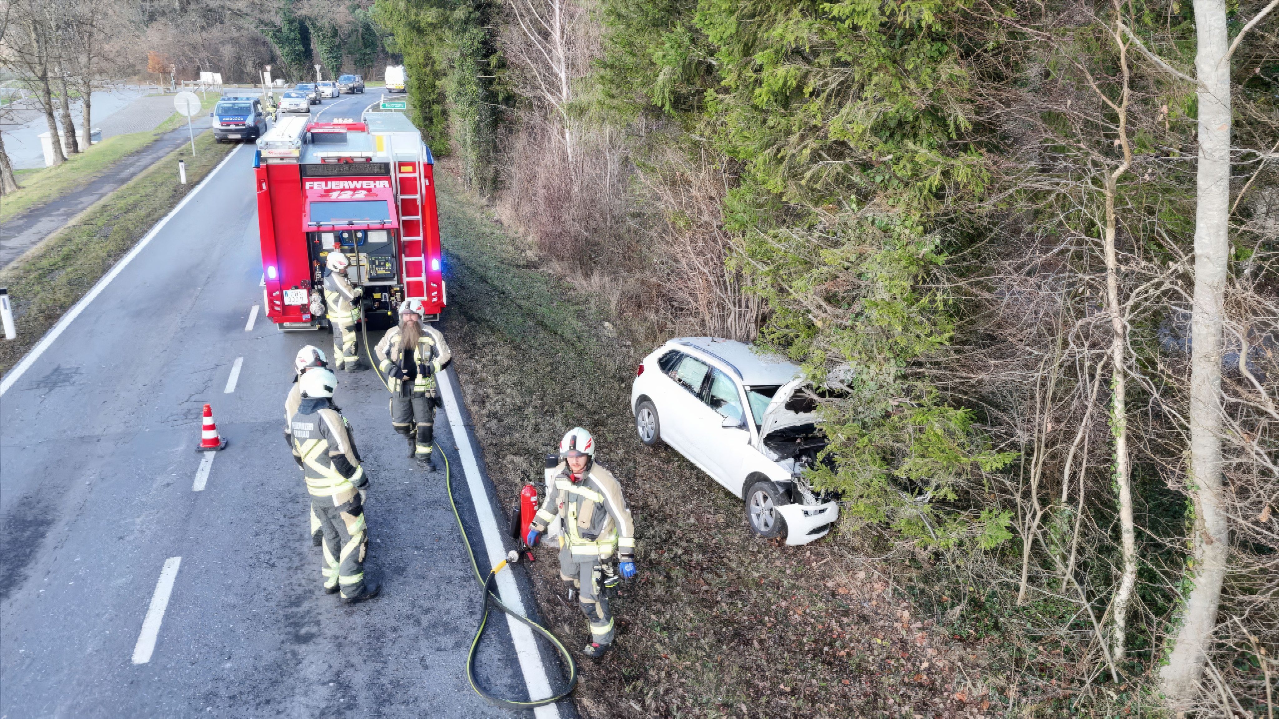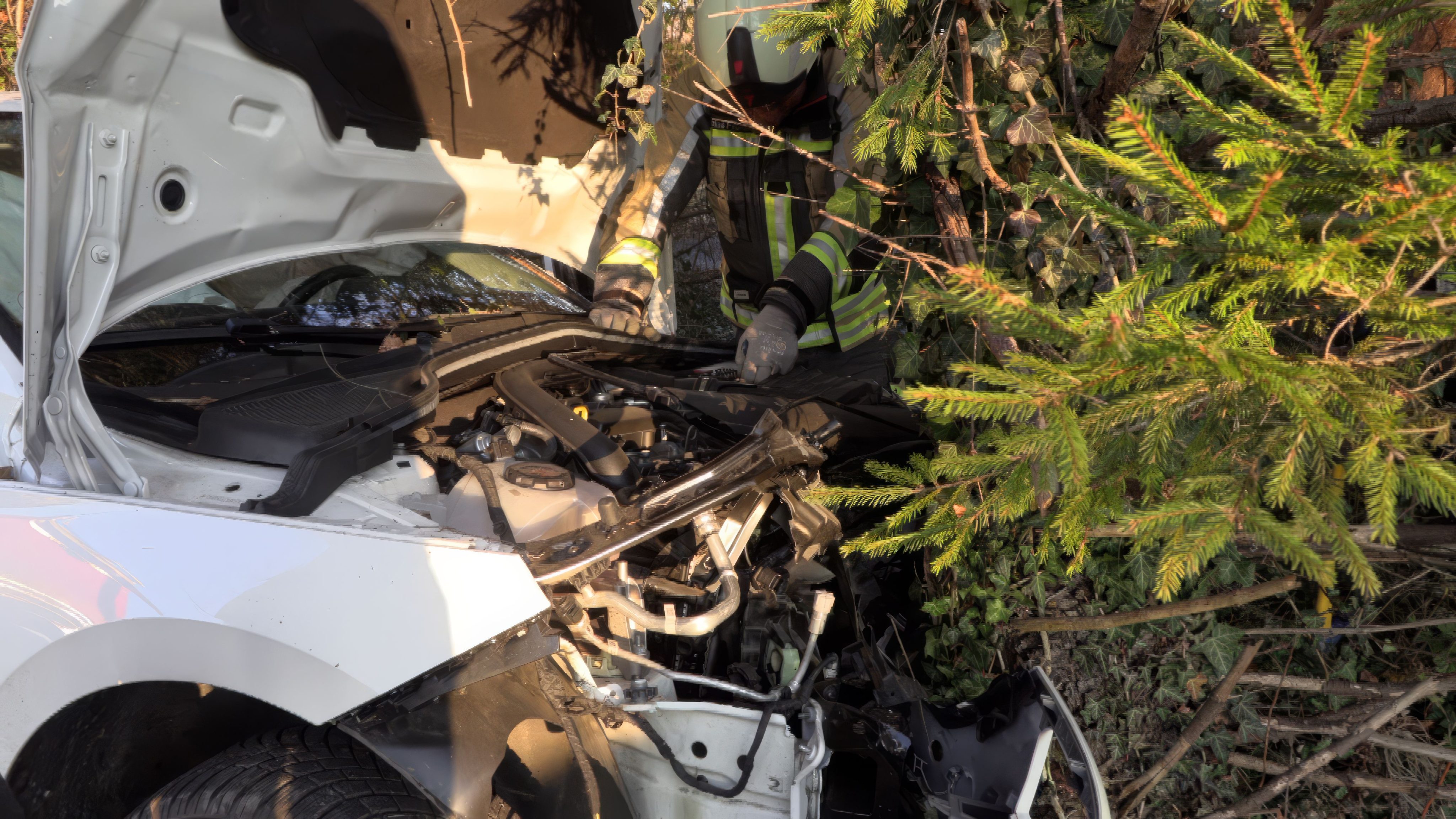 Die Feuerwehr sichert das verunfallte Fahrzeug, das frontal gegen einen Baum geprallt ist.