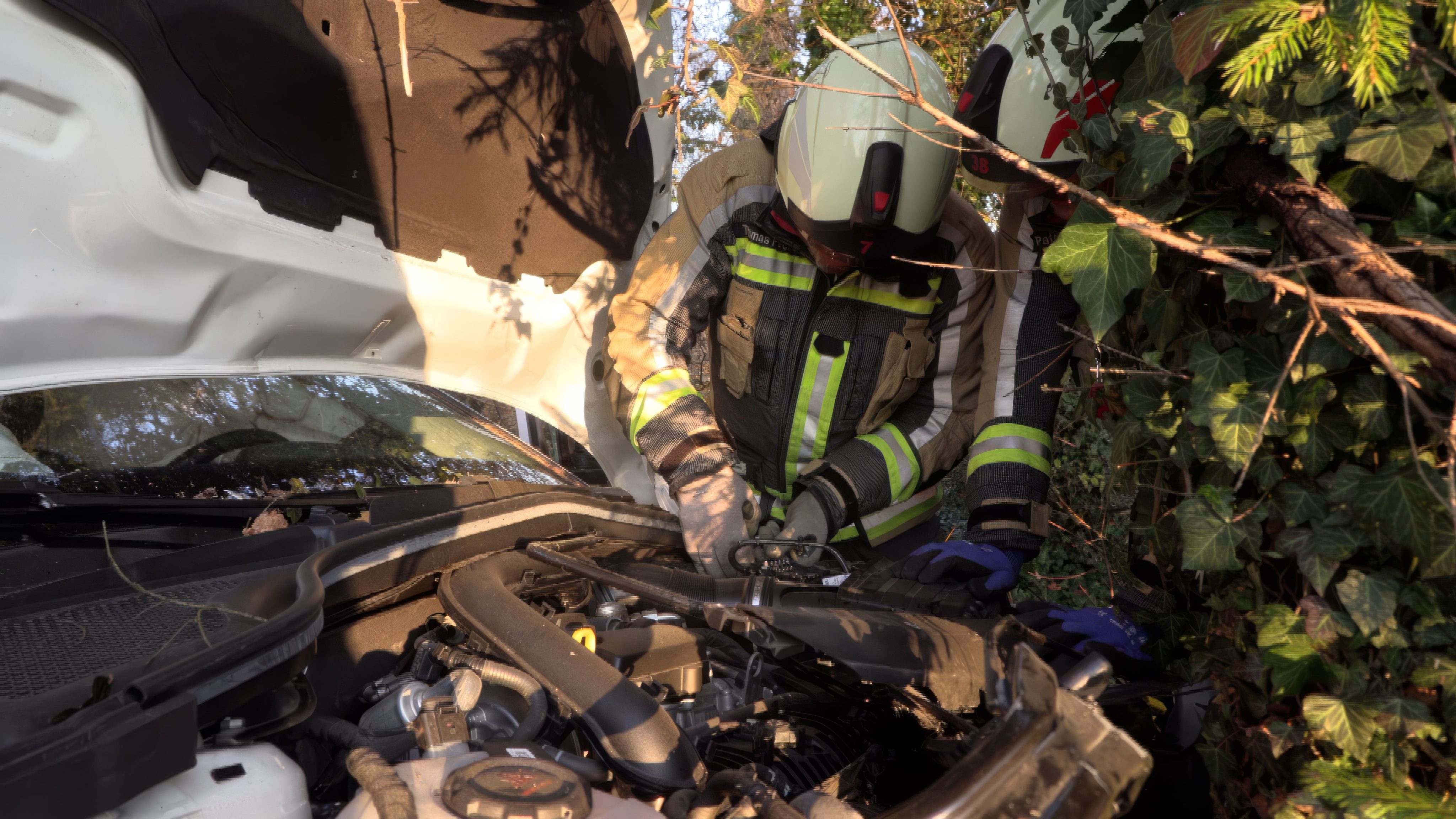 Feuerwehrleute arbeiten sich zum beschädigten Motorraum vor, um das Fahrzeug nach dem Crash in Gaißau zu stabilisieren und weitere Gefahren auszuschließen. ©VOL.AT