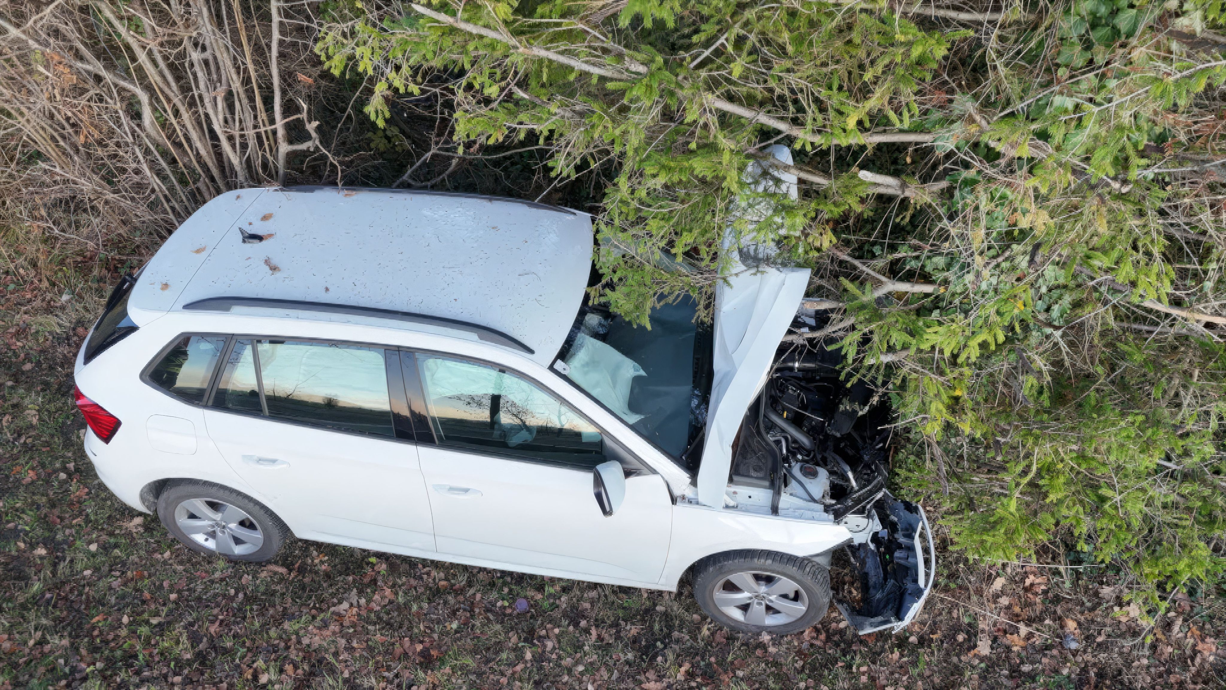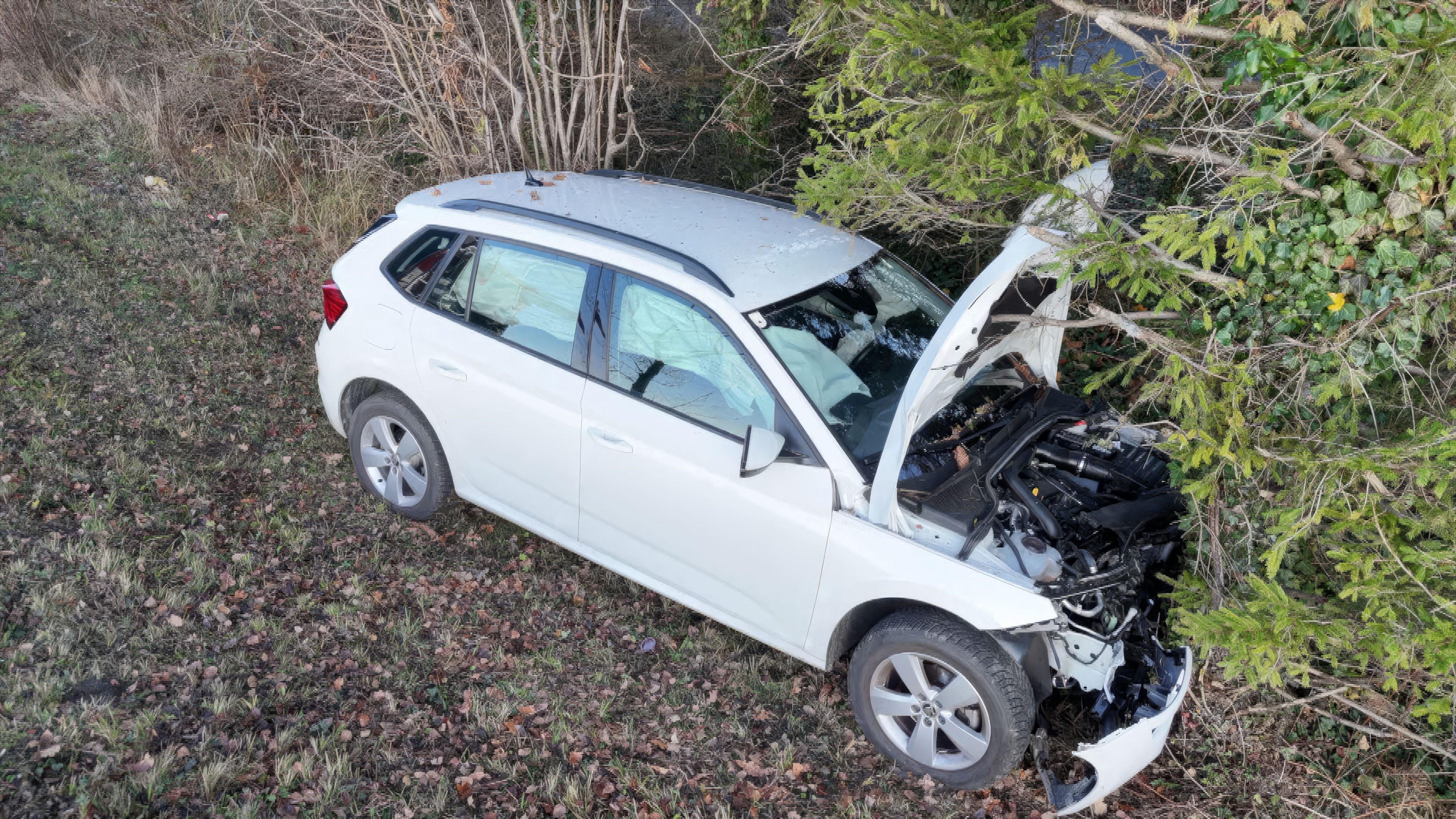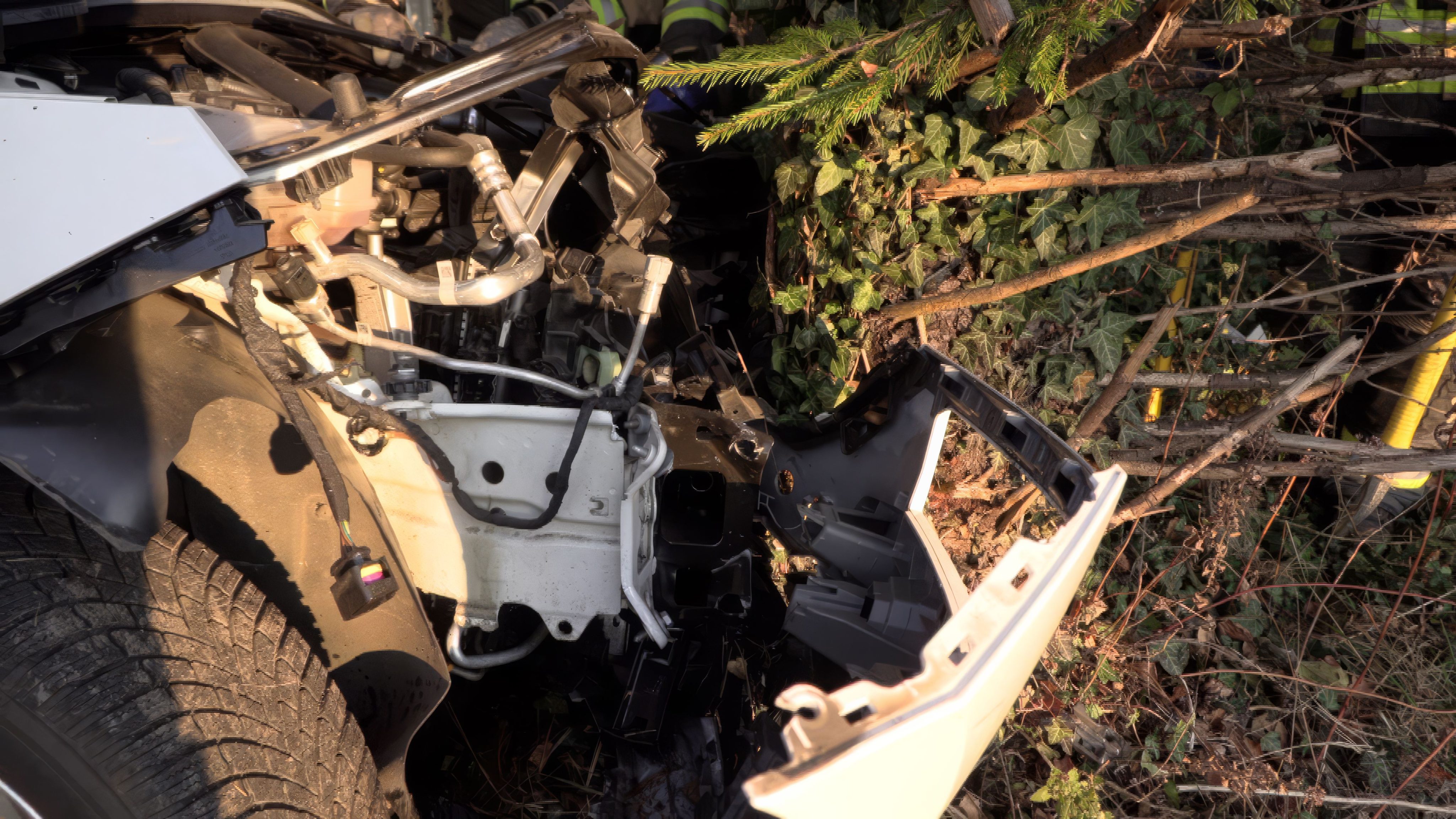 Der Wagen kam neben der L19 zum Stillstand; der gesamte Frontbereich wurde beim Aufprall schwer beschädigt.