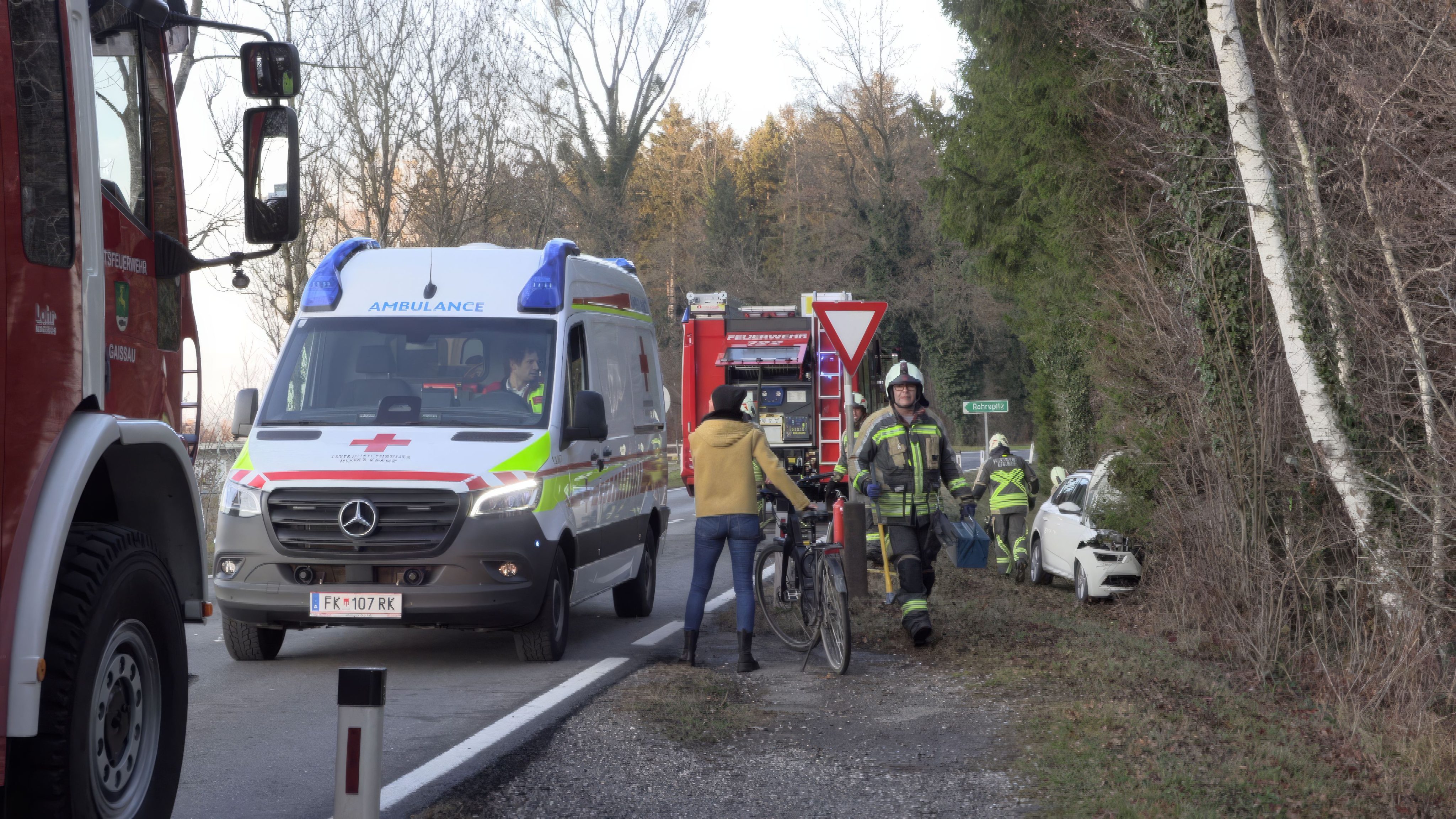 Der beschädigte Pkw steht im Straßengraben, während die ersten Einsatzkräfte an der Unfallstelle in Gaißau eintreffen.
