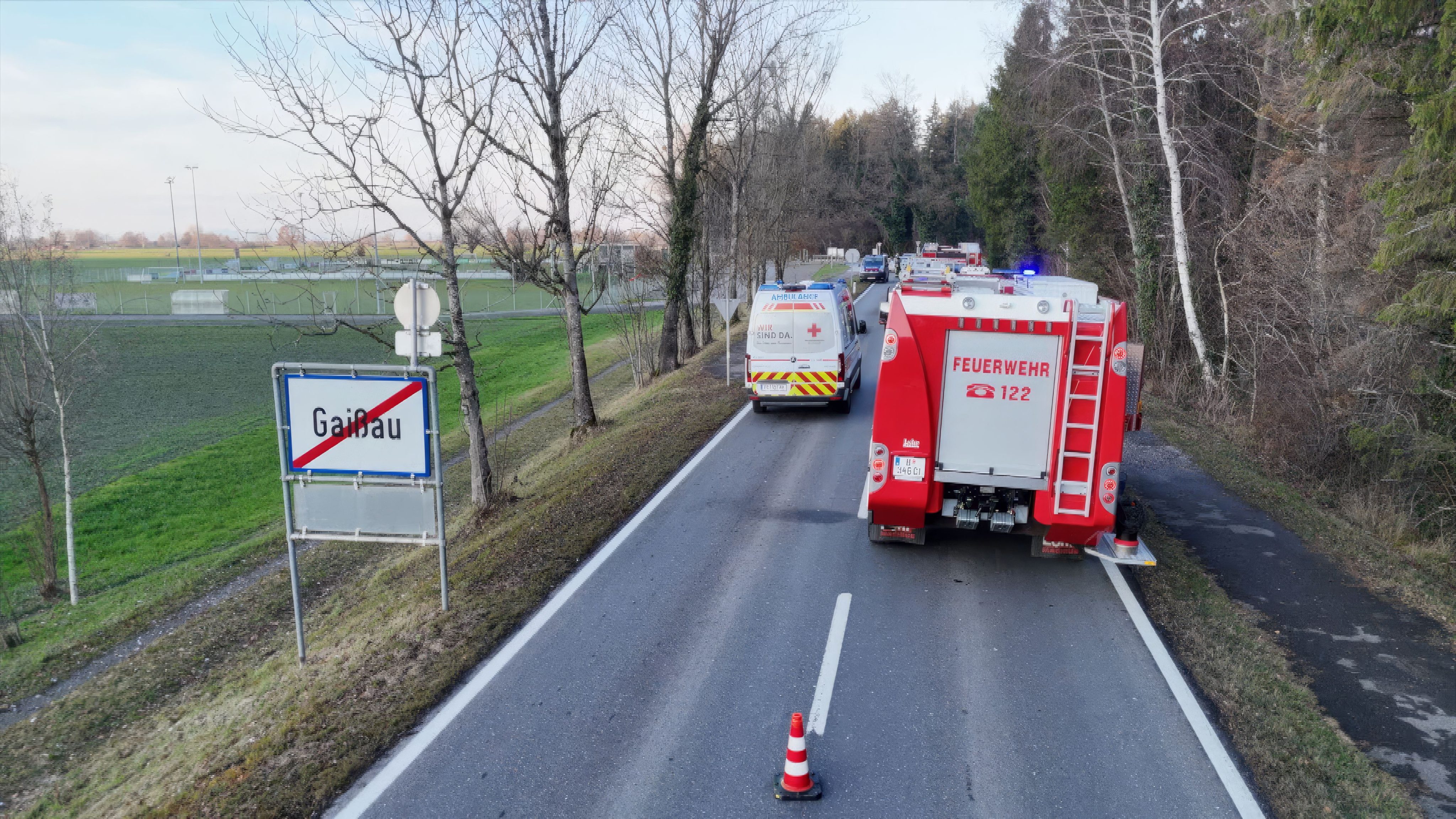 Feuerwehr und Rettung sichern die L19 im Bereich des Ortsendes von Gaißau und bereiten die Versorgung der verletzten Lenkerin vor.