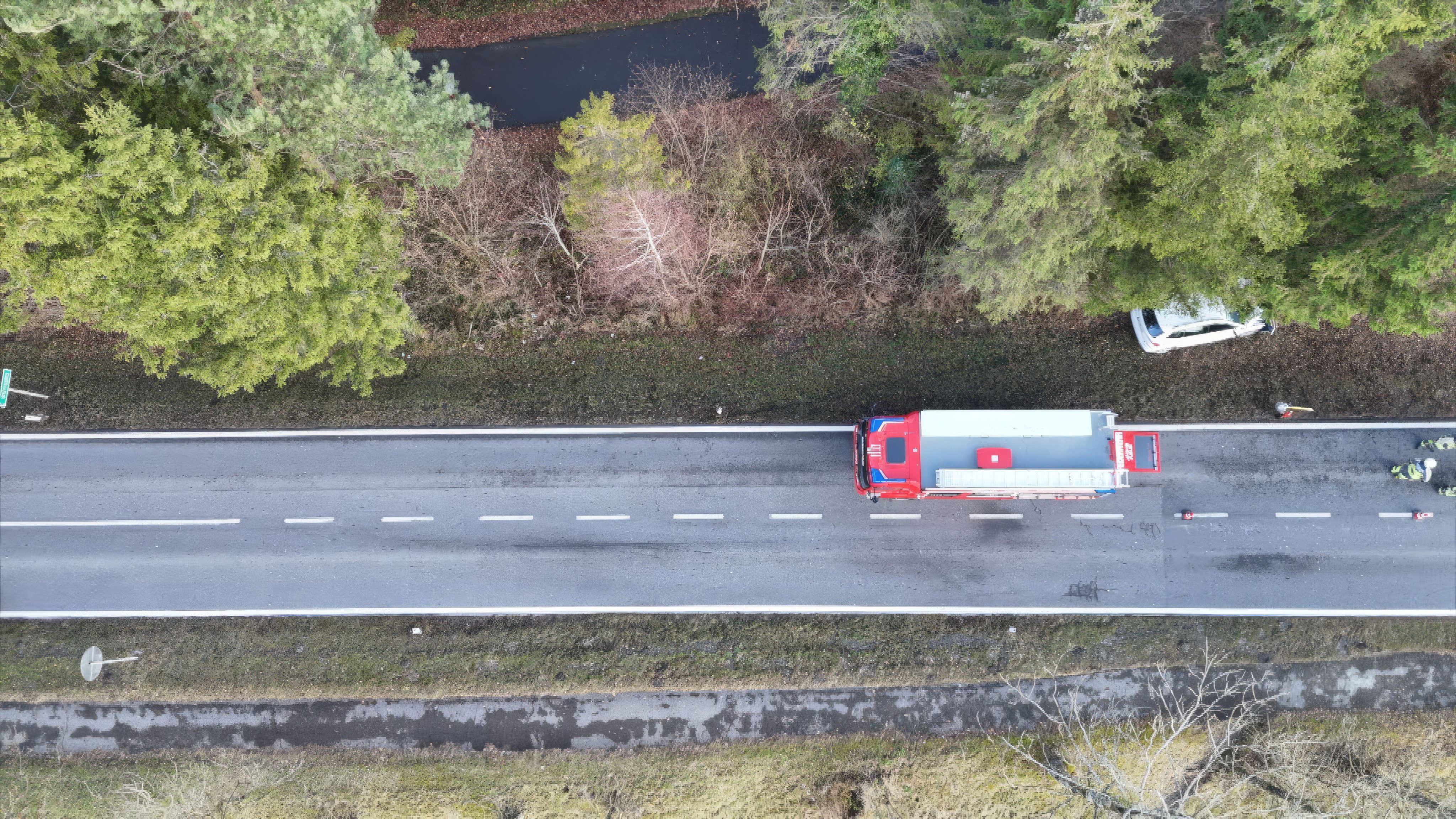 Eine Drohnenaufnahme zeigt die Lage des Unfallfahrzeugs im dichten Gebüsch sowie die Aufstellung der Einsatzfahrzeuge auf der L19.