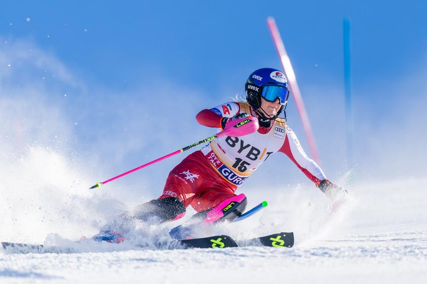 Katharina Liensbergers Rennen ist bereits nach wenigen Sekunden vorbei. Die Vorarlbergerin scheidet im ersten Durchgang aus und verpasst damit ein Ergebnis beim Heimrennen.