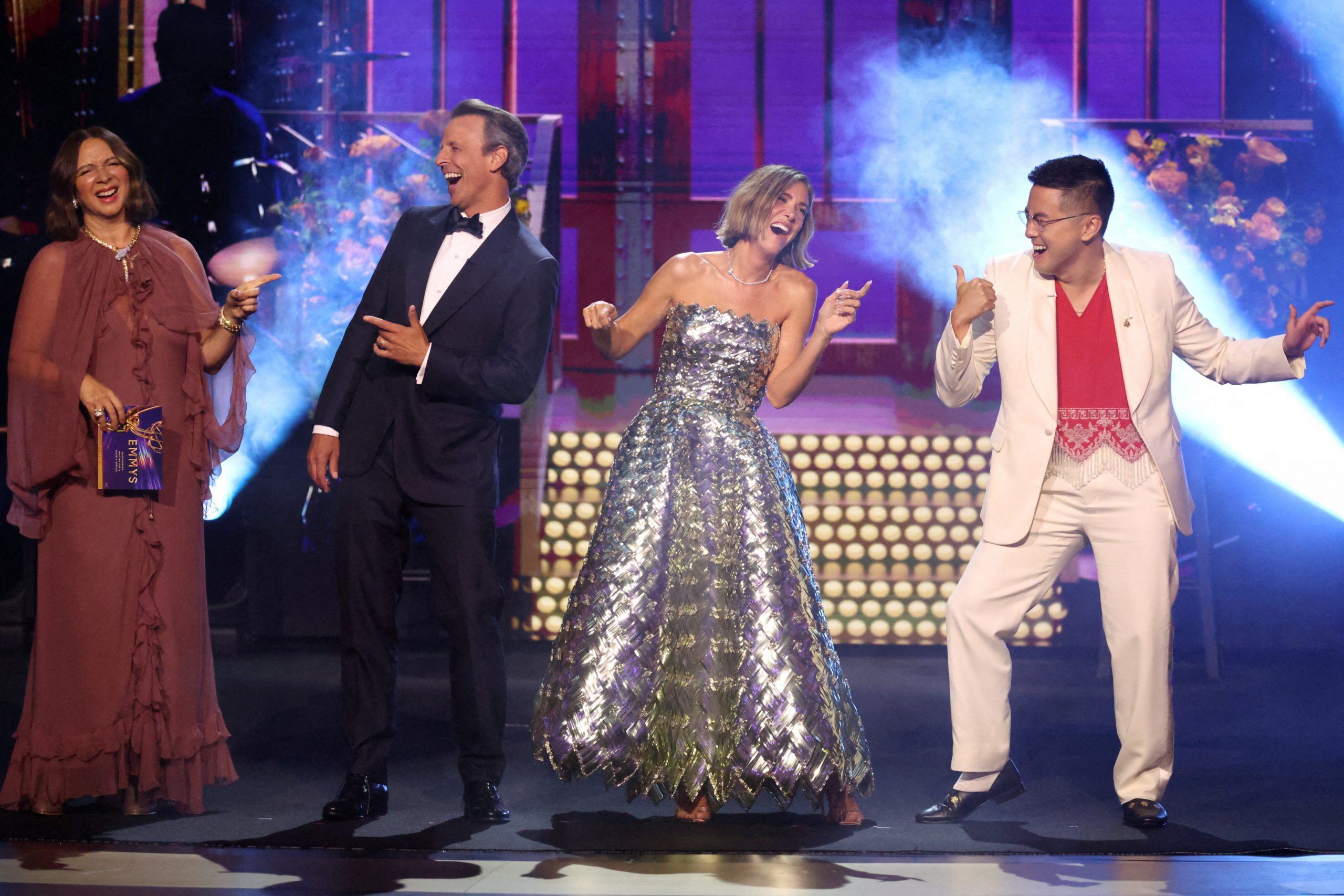 Dass den USA in weniger als acht Wochen eine Präsidentschaftswahl bevorsteht, war während der Verleihung kaum zu spüren. Es gab einzig einige blasse Aufforderungen zur Stimmabgabe und Mahnungen zur Vielfalt der Vereinigten Staaten. Selbst Politshow-Moderator John Oliver nahm in seiner Dankesrede für die Auszeichnung von "Last Week Tonight" als beste geskriptete Unterhaltungssendung keinen Bezug auf Donald Trump oder Kamala Harris.