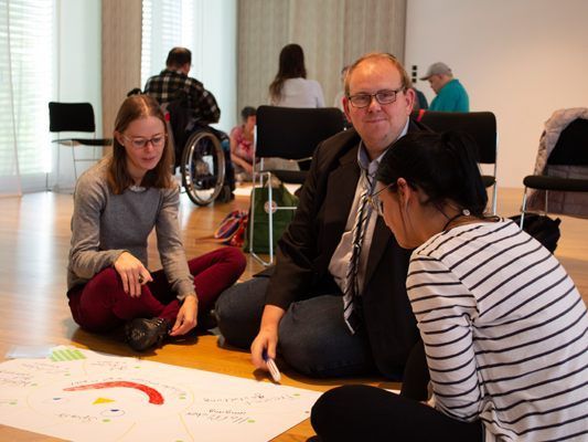 Montagvormittag im Pfarrzentrum „zemma“ in Bludenz: In kleinen Gruppen wird rege diskutiert und Anregungen und Wünsche werden artikuliert. Die TeilnehmerInnen arbeiten gemeinsam daran, wie sie ihr Sprecheramt gut ausführen können. „Die Selbstbestimmung unserer KlientInnen ist uns ein wichtiges Anliegen“, sagt Carmen Amann, Servicestelle und Koordinatorin Selbstvertretung der Caritas Vorarlberg. „Die Rolle der Menschen mit Beeinträchtigung hat sich in den letzten Jahren und Jahrzehnten stark gewandelt. Sie treten mit mehr Selbstbewusstsein auf und fassen ihre Anliegen in Worte.“ Mit Rat und Tat zur Seite stehen den Menschen mit Beeinträchtigung UnterstützerInnen, das sind speziell geschulte MitarbeiterInnen.