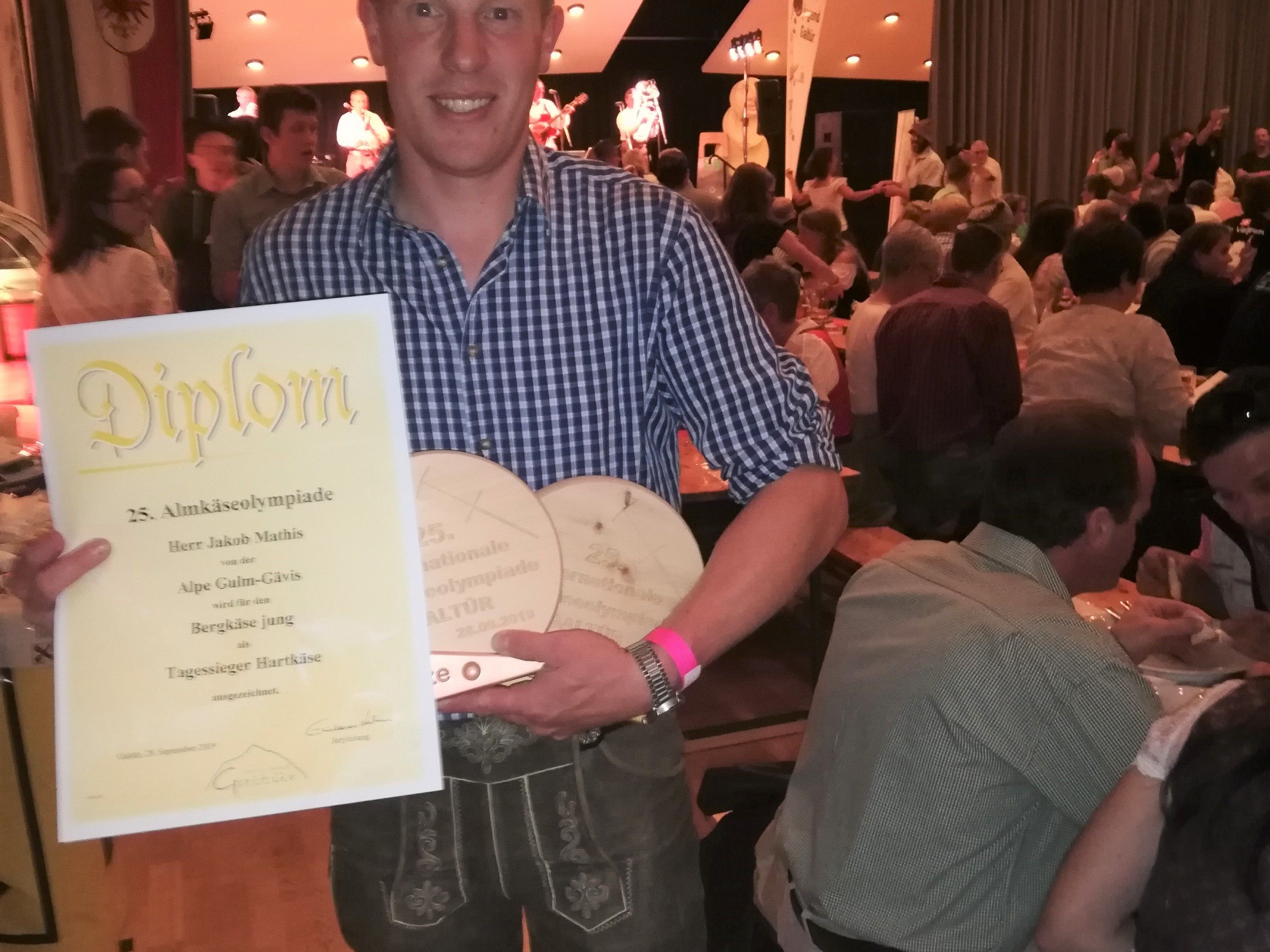 - ALMKÄSEOLYMPIADE 2019:Der Tagessieg und damit die goldene Sennerharfe in der Kategorie Hartkäse ging 2019 an Jakob Mathis von der Alpe Gulm-Gävis aus Österreich.