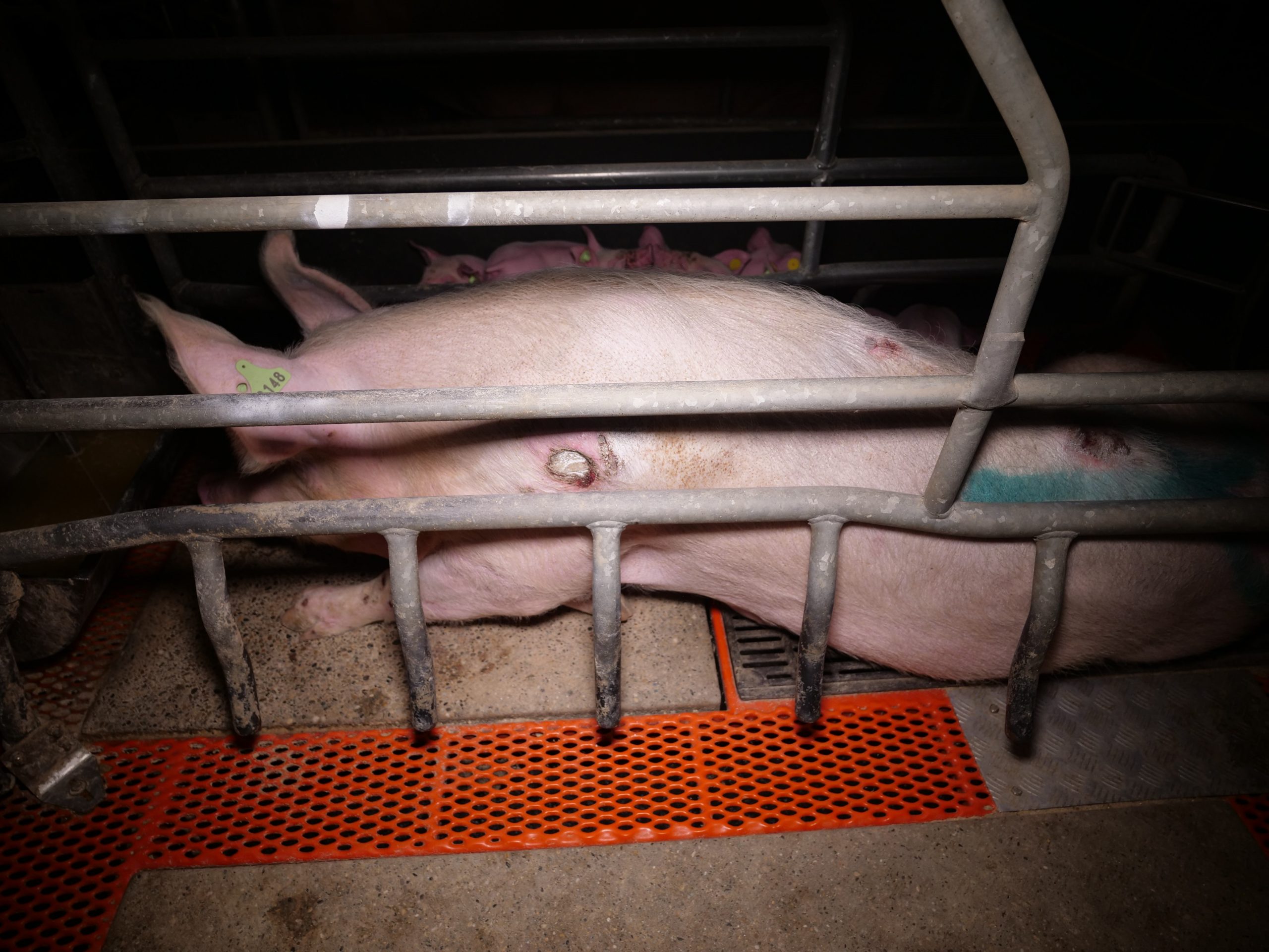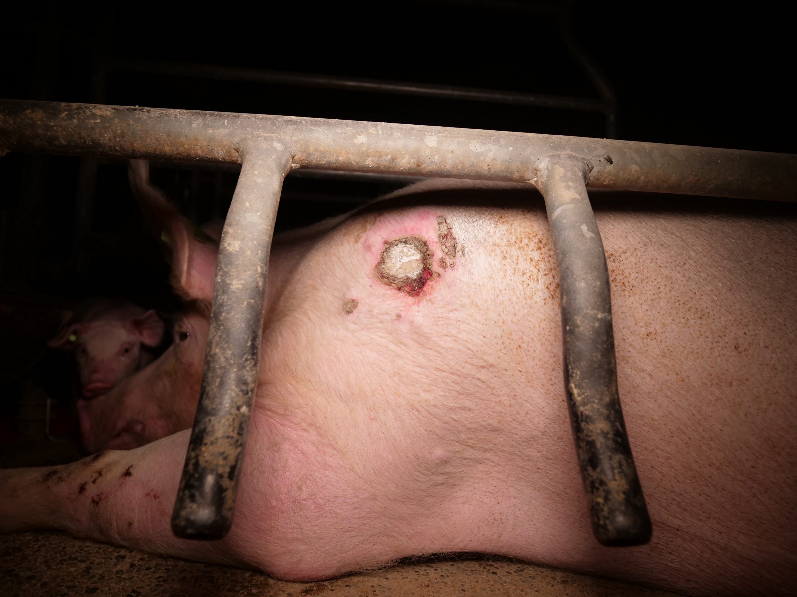 Mutterschweine in engen Kastenständen haben Wunden an den Schultern und Beinen. Einige