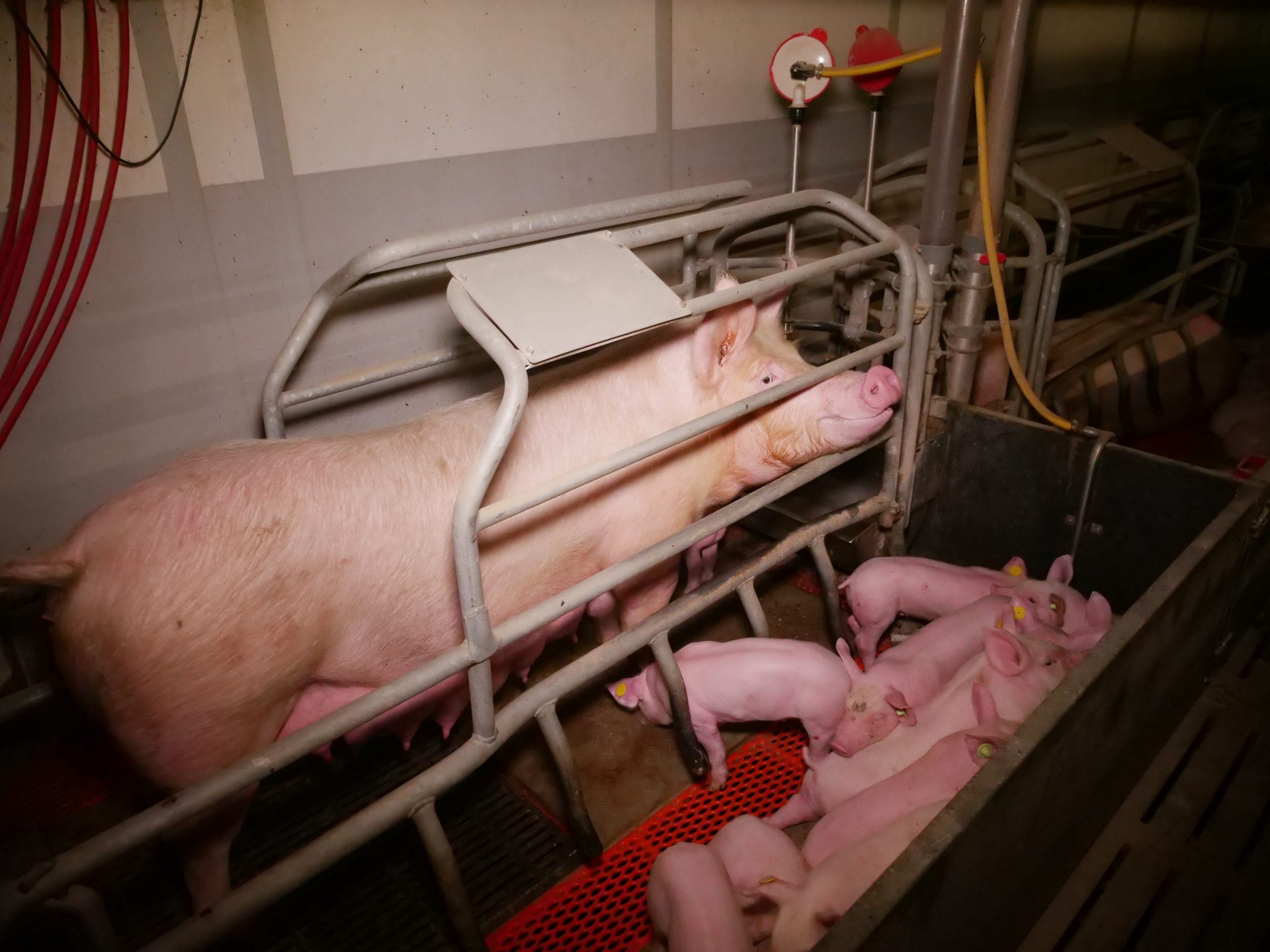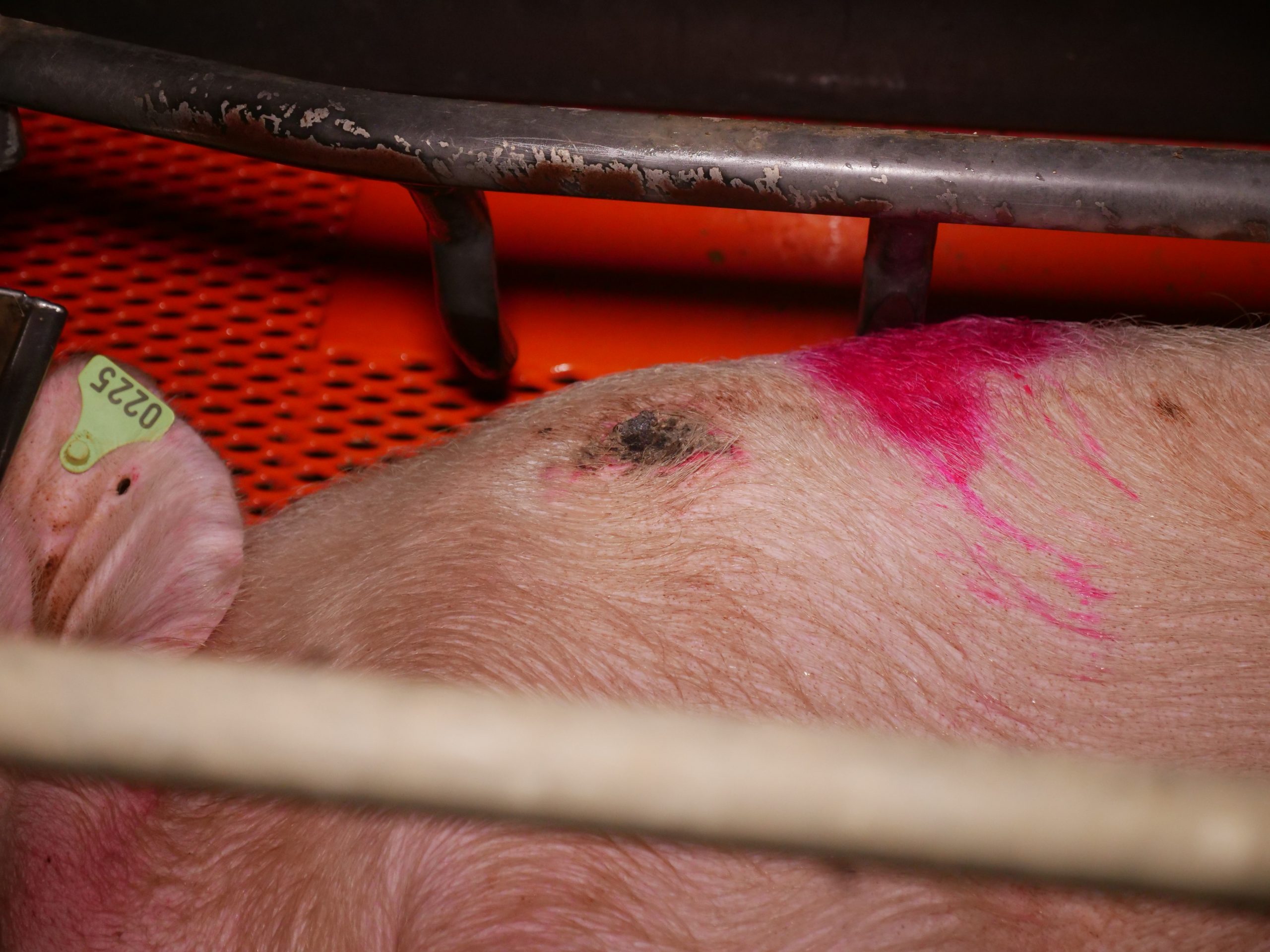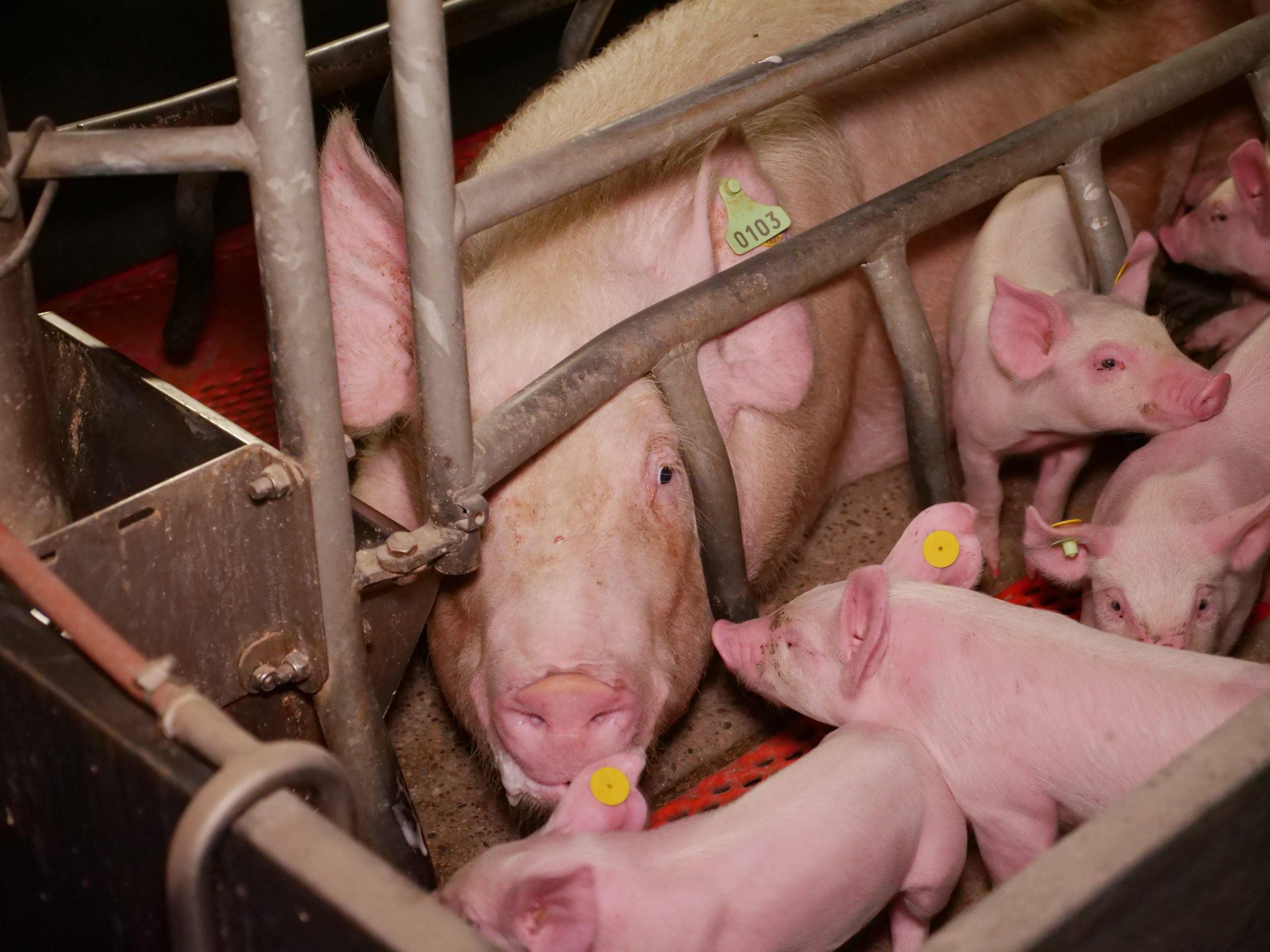 Ferkel haben blutige Bissverletzungen oder Hautveränderungen. Besonders auffällig ist das völlige Fehlen jeglichen Beschäftigungsmaterials für die Sauen im Kastenstand. Per Gesetz ist es gefordert, Schweinen "ständigen Zugang" zu Beschäftigungsmaterial zu bieten (vgl. 1. ThVO, Anlage 5, Punkt 2.7) - eine Ausnahme für Mutterschweine ist im Gesetz nicht vorgesehen. Auch die Gruppenbuchten - wie im Mastbetrieb auch hier mit Vollspaltenboden - scheinen wiederholt einen Mangel an Beschäftigungsmaterial aufzuweisen.