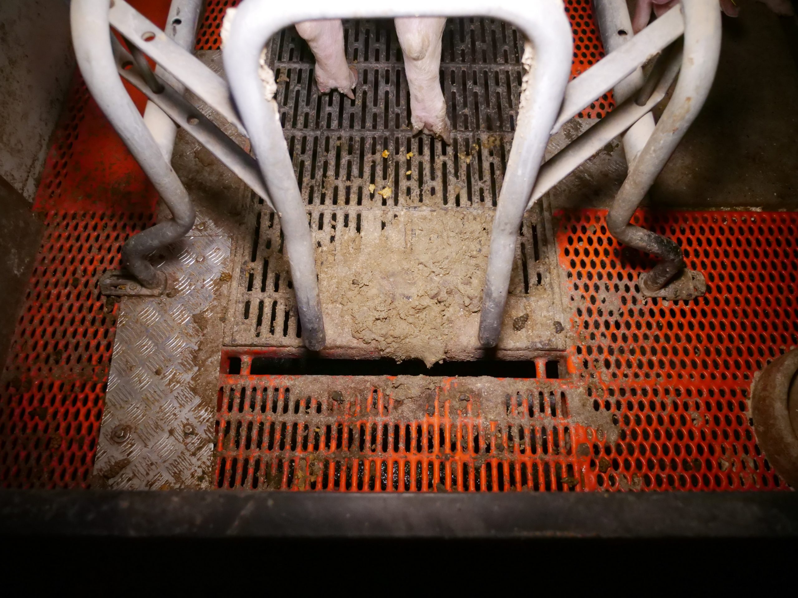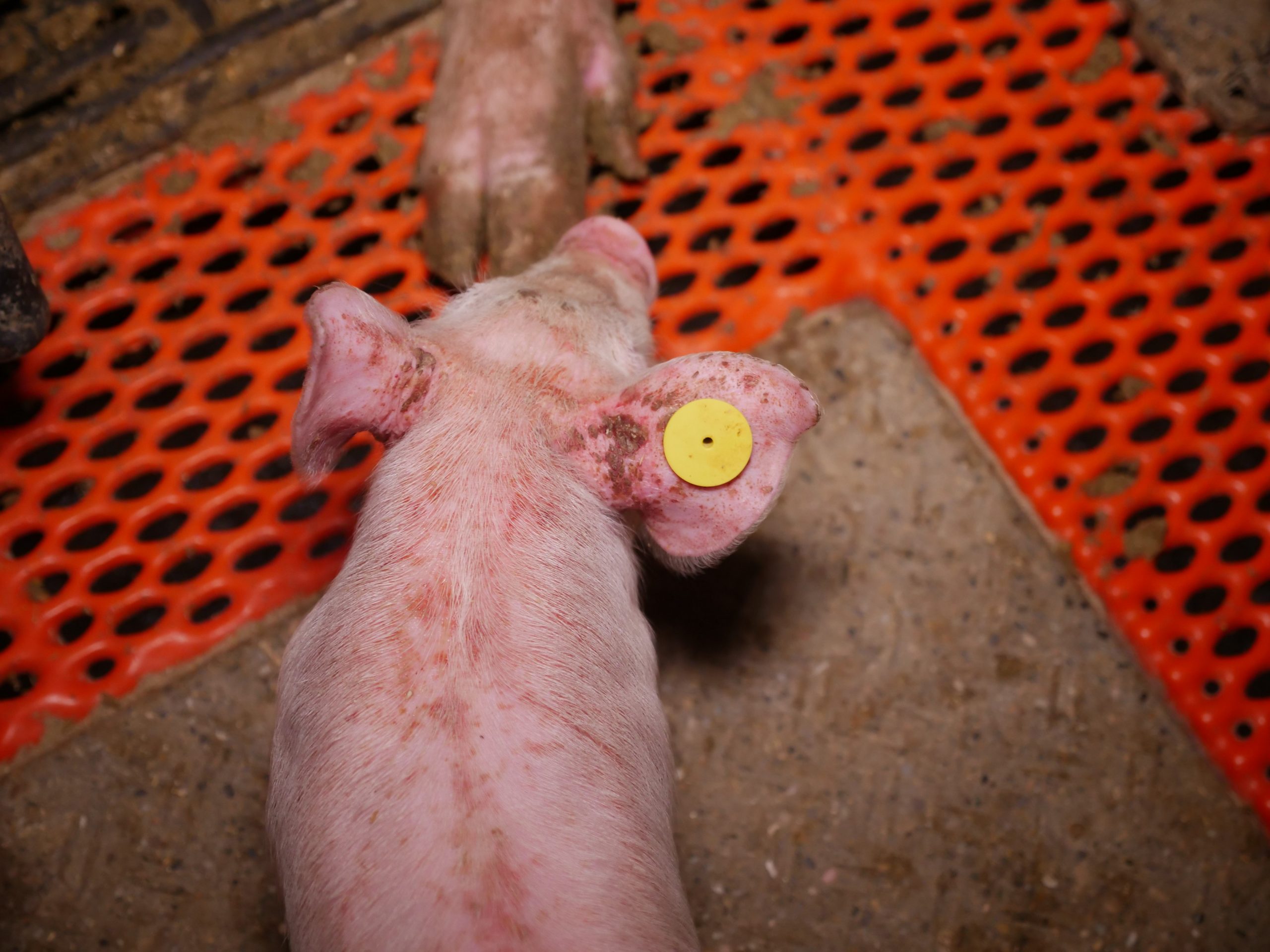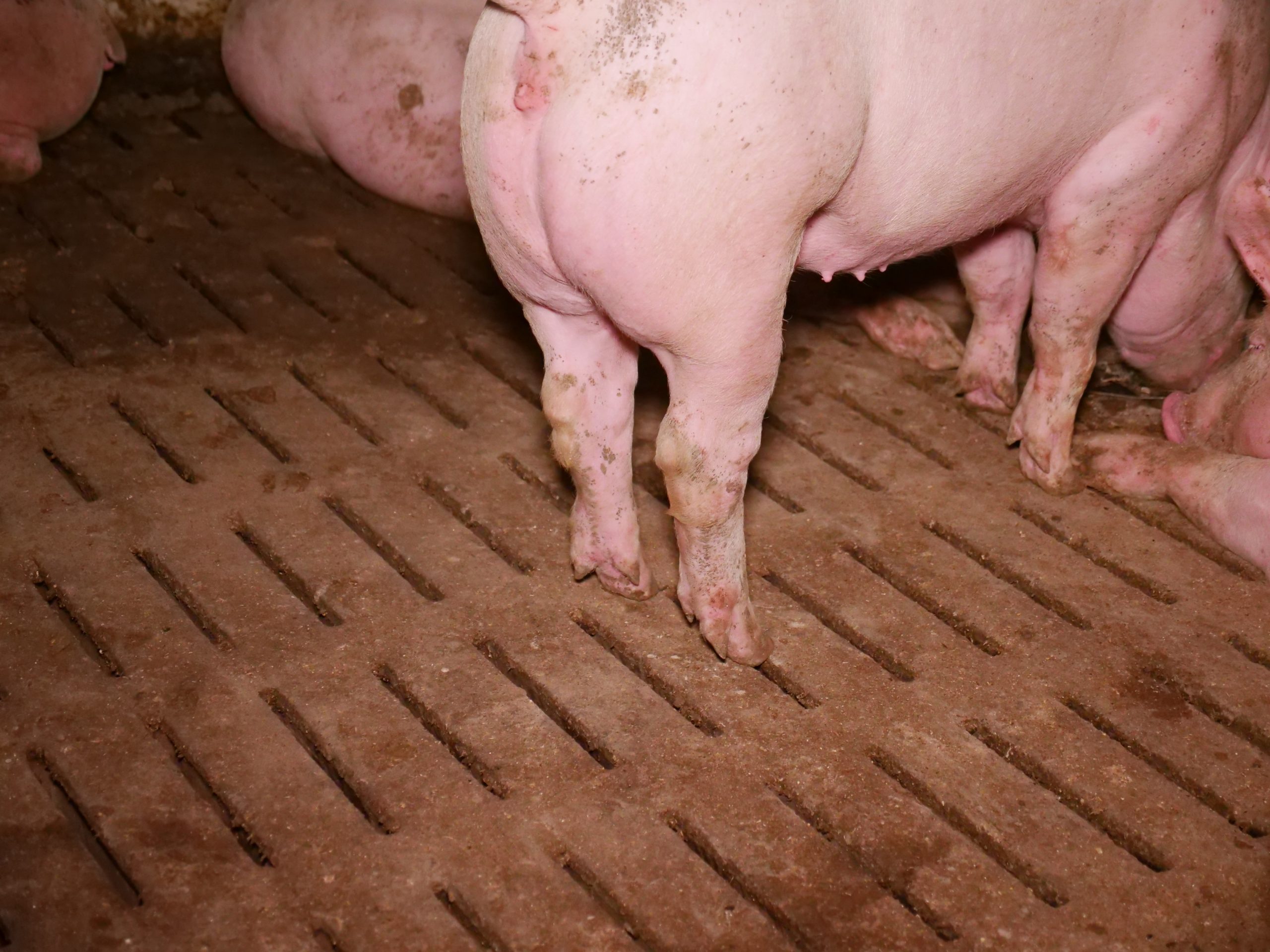 Ferkel haben blutige Bissverletzungen oder Hautveränderungen. Besonders auffällig ist das völlige Fehlen jeglichen Beschäftigungsmaterials für die Sauen im Kastenstand. Per Gesetz ist es gefordert, Schweinen "ständigen Zugang" zu Beschäftigungsmaterial zu bieten (vgl. 1. ThVO, Anlage 5, Punkt 2.7) - eine Ausnahme für Mutterschweine ist im Gesetz nicht vorgesehen. Auch die Gruppenbuchten - wie im Mastbetrieb auch hier mit Vollspaltenboden - scheinen wiederholt einen Mangel an Beschäftigungsmaterial aufzuweisen.