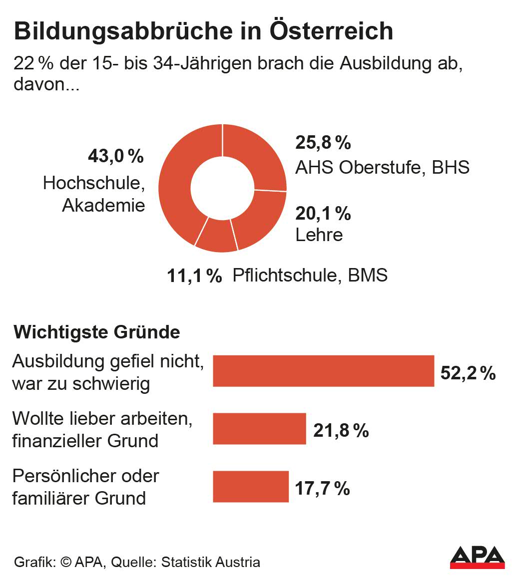 The highest completed education makes a difference here: By far, AHS graduates most frequently dropped out of education after graduation (33 percent). They are followed by people with a maximum of compulsory education (24) or tertiary education (22). Dropouts are least common among people with apprenticeships (17.5) and BHS graduation (19).