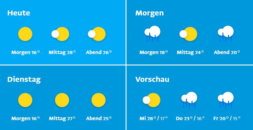 Mögliche Nebelfelder verschwinden rasch, es wird überwiegend sonnig, vormittags sogar nahezu wolkenlos. Am Nachmittag tauchen zwar ein paar Quellwolken über den Bergen auf, diese bleiben aber harmlos. Es wird sommerlich warm. Tiefstwerte: 10 bis 15 Grad, Höchstwerte: 25 bis 29 Grad.