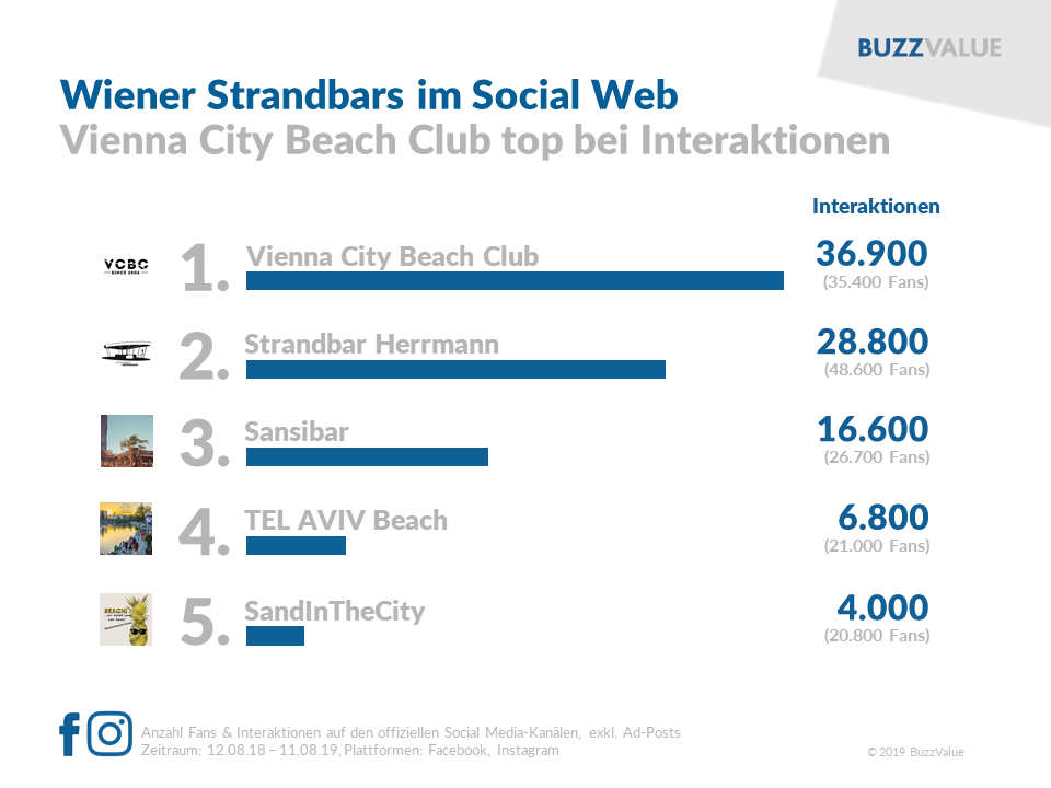 Im Interaktionsranking konnte sich der Vienna City Beach Club mit knapp 37.000 Reaktionen, Shares und Kommentaren in den vergangenen zwölf Monaten auf Facebook und Instagram mit Vorsprung auf dem ersten Platz positionieren. Strandbar Hermann liegt trotz höchster Fanzahl nur auf Platz 2, erreicht in einem Jahr 28.800 Interaktionen auf seinen offiziellen Social Media-Seiten. Auch die Sansibar (16.600 Interaktionen) nutzt Facebook und Co. aktiv zur Kommunikation und Interaktion mit den Followern. Tel Aviv Beach (6.800) und Sand in the City (4.000) erzielen trotz beachtlicher Fanzahlen nur wenige Likes, Shares und Kommentare. "Reine Fanzahlen spielen in den sozialen Medien kaum noch eine Rolle, vielmehr geht es darum, wie umfangreich ich meine Fans zur Interaktion bewegen kann und wie viel Reichweite ich als Marke dadurch erziele", betont Zimmer.