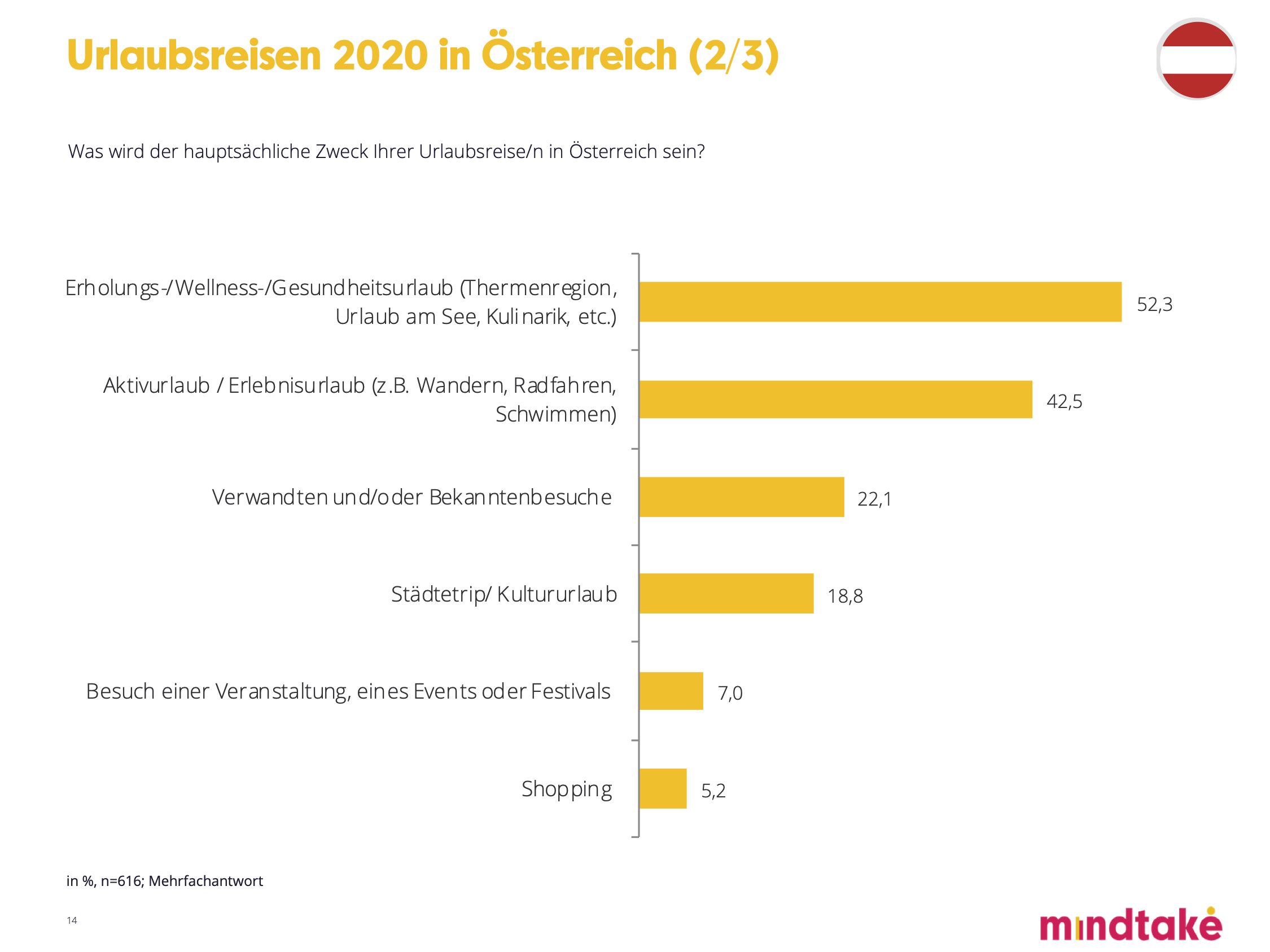 Am beliebtesten, wie schon im Vorjahr, sind Erholungs- und Wellnessurlaube (52,3 %), gefolgt von Aktiv- und Erlebnisurlauben (42,5 %): "Man merkt klar, die Leute wollen hinaus in die Natur. Und was gibt es da Besseres als unsere Seen und Berge?", zeigt Gratzer auf. Einbußen gibt es hingegen im Boom-Segment der letzten Jahre: dem Städteurlaub. "Die Betriebe stehen hier teilweise vor extremen Herausforderungen, die vermutlich in den nächsten paar Jahren nicht leichter werden. Hier braucht es dringen maßgeschneiderte Lösungen, die rasch bei den Betrieben ankommen müssen", fordert der Generalsekretär.