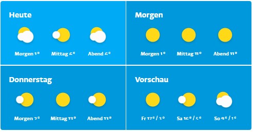 Ab Mittwoch kündigt sich eine nachhaltige Wetterbesserung an. Laut Prognose der Zentralanstalt für Meteorologie und Geodynamik (ZAMG) geht Vorarlberg in eine Phase ruhigen Hochdruckwetters über. In der vergleichsweise trockenen Luft lösen sich morgendliche Restwolken rasch auf, der Himmel präsentiert sich dann meist wolkenlos. Nach einem frischen bis kalten Tagesbeginn mit Tiefstwerten zwischen -2 und +4 Grad steigen die Temperaturen auf milde 11 bis 16 Grad.