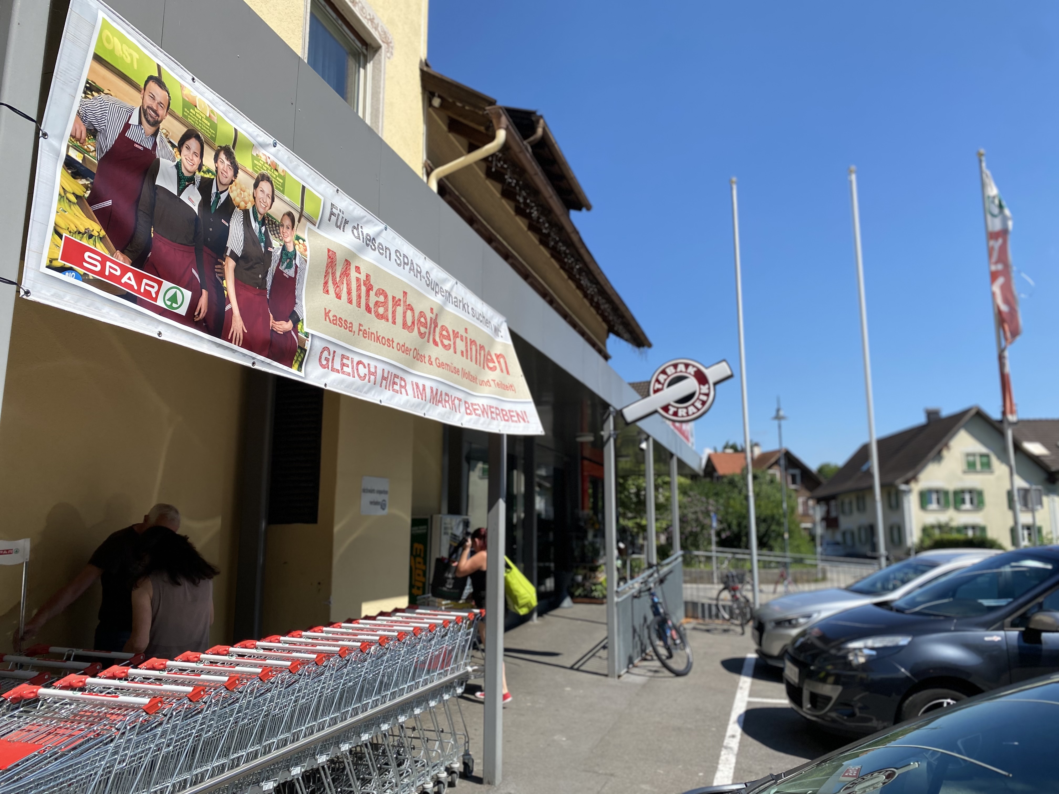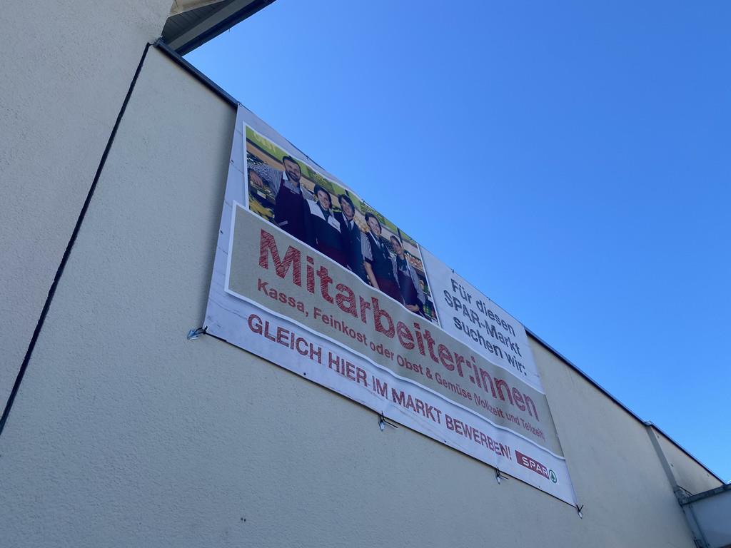 Auch beim Spar Supermarkt Elisabeth Jäger in Feldkirch hängt ein Plakat mit einer Stellenausschreibung. Wie die VN berichten, läuft der Laden seit Monaten im Notbetrieb. Auch hier ist die Frischetheke nur noch vormittags geöffnet, da das Personal knapp ist.