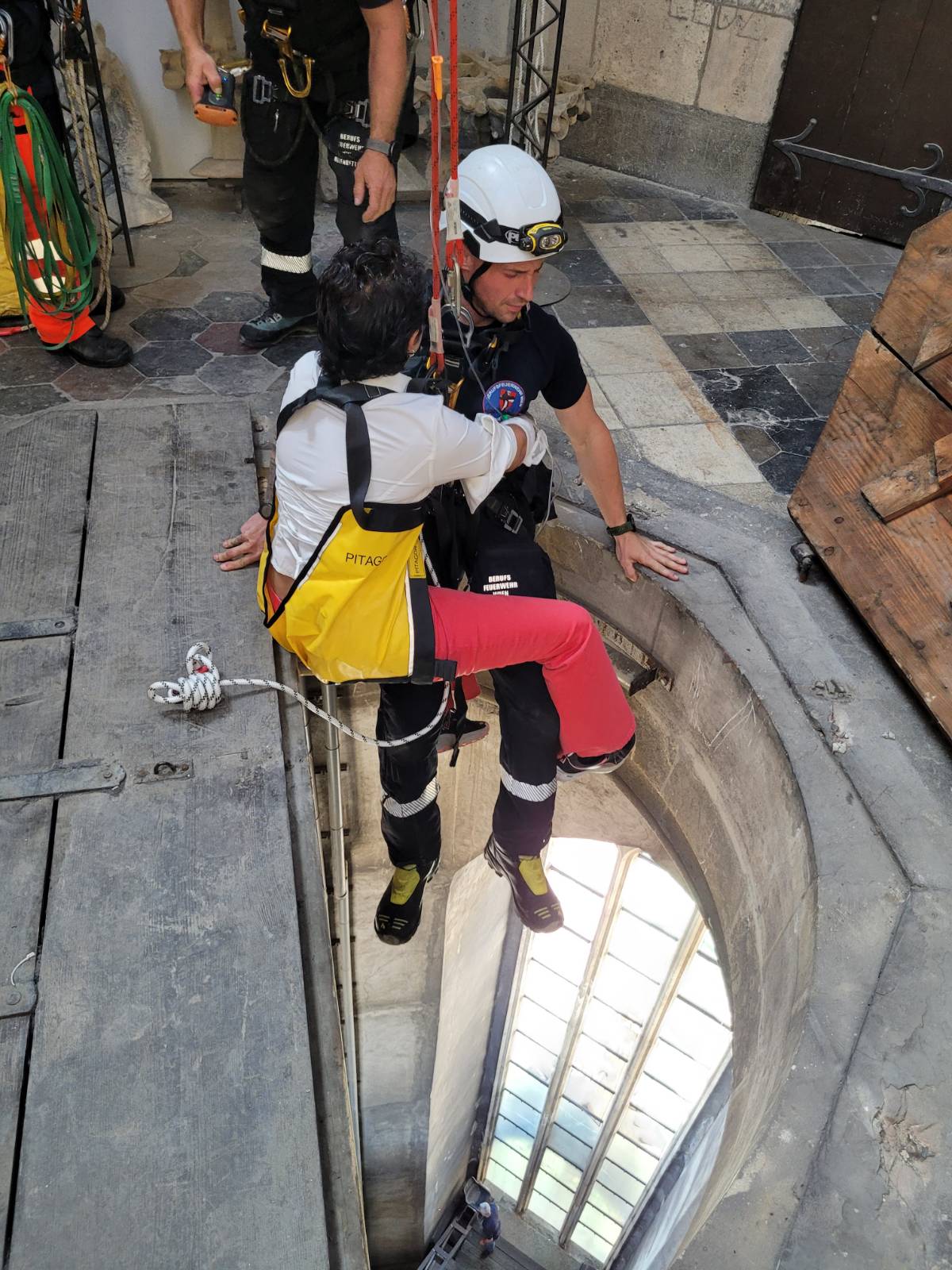 Da die Frau kreislaufbedingt nicht mehr in der Lage war, den Rückweg anzutreten, wurde in Absprache mit der Berufsrettung entschieden, sie von einem ausgebildeten Höhenretter der Feuerwehr in Sicherheit zu bringen. In der Türmerstube wurde zu diesem Zweck zunächst an einem Haken an der Decke ein so genannter Sicherungsfixpunkt angebracht, erläuterte Schimpf im Gespräch mit der APA. Dann wurden die erforderlichen technischen Gerätschaften und zwei Seile - eines diente der Sicherung - angelegt und die geschwächte Frau und ihr Retter mittels einer Akkuseilwinde über den Glockenturm abgeseilt.