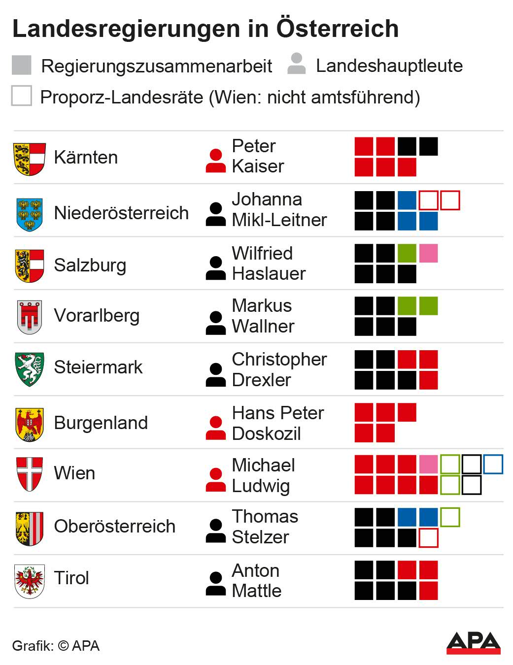 Insgesamt sind die Landesregierungen jetzt ziemlich variantenreich: Aktuell gibt es mit der Steiermark und Tirol zweimal Schwarz-Rot, einmal Rot-Schwarz (Kärnten), zweimal Schwarz-Blau (Oberösterreich und Niederösterreich), einmal Schwarz-Grün (Vorarlberg), einmal Schwarz-Grün-Pink (Salzburg), einmal Rot-Pink (Wien) - und seit der Niederösterreich-Wahl nur noch eine einzige "Absolute", nämlich die der SPÖ im Burgenland.