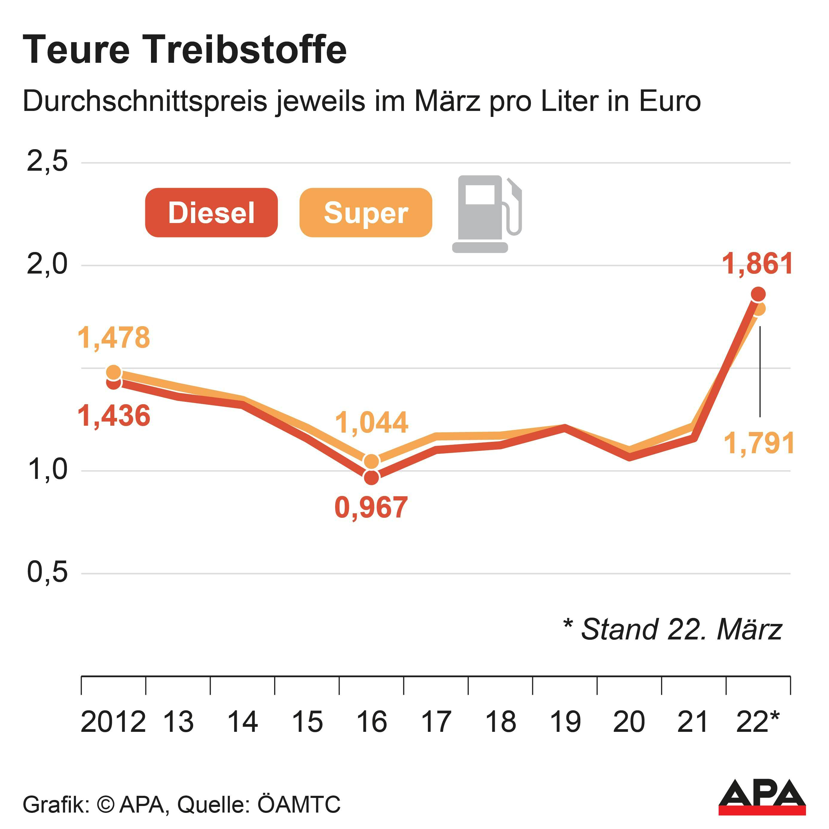 Im heurigen März mussten 1,791 Euro für Super (plus 31 Cent, 17 %) und 1,861 (plus 43 Cent, 23 %) für Diesel bezahlt werden.