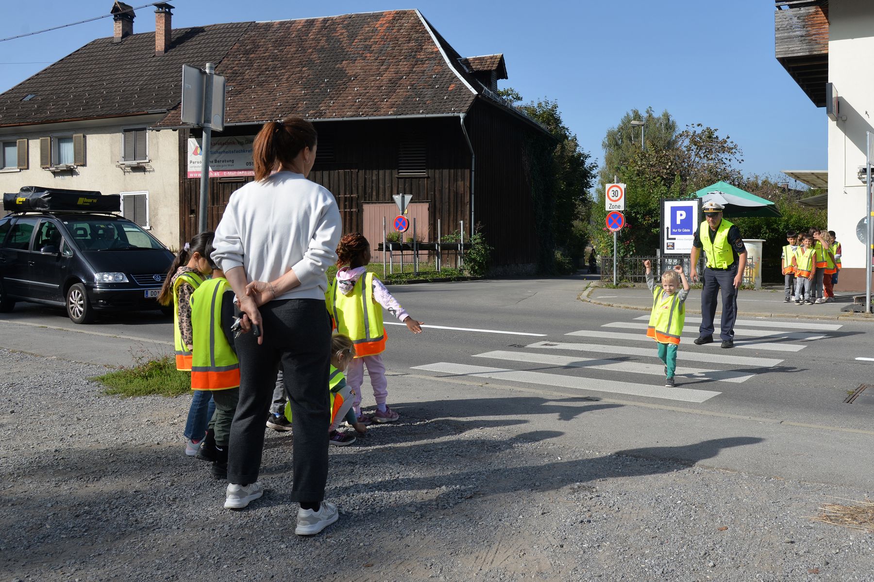 Fallen die so genannten Eltern-Taxis weg, erhöht sich außerdem die Sicherheit im Umfeld der Schule oder des Kindergartens, denn viele Unfälle passieren im dichten Verkehrsaufkommen zu Bring- und Abholzeiten. Kinder sind zwischen parkenden Autos schwer zu sehen und verhalten sich unvorhersehbar. Auch diese Situationen werden bei der Verkehrsstunde mit der Stadtpolizei Dornbirn geübt. „Sich ganz groß machen, die Hand hoch in die Luft strecken und dann links – rechts – und wieder links schauen. Erst wenn auf allen Seiten alle stehen, darf ich gehen,“ wiederholen die Schülerinnen und Schüler der VS Edlach gemeinsam. Den Schulweg will hier niemand missen, denn „da haben meine Freundin und ich endlich Zeit zum Reden, und zwar allein,“ erklären zwei Mädchen.