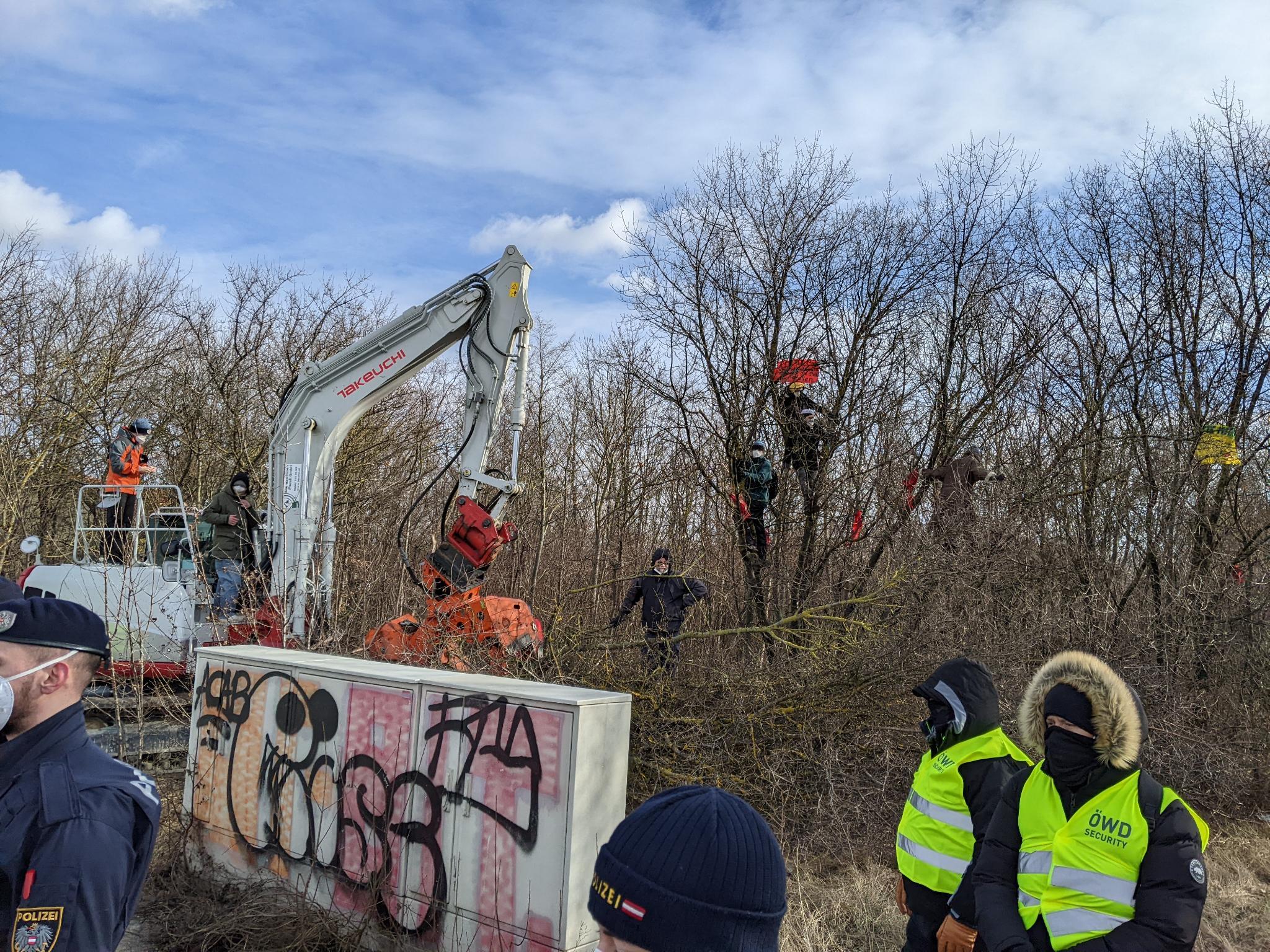 Am 1. Februar wurde nicht nur das Protestcamp von LobauBleibt in der Hausfeldstraße gewaltsam geräumt. Während die Öffentlichkeit auf die zahlreichen festgenommen jungen Klimaschützer und die Zerstörung der Pyramide schaute, startete die Stadtregierung die Kettensägen für einen Kahlschlag: Hunderte Bäume wurden gefällt, unterstützt von der Polizei. Zahlreiche, teils minderjährige Aktivist versuchten, sie mit ihren Körpern zu schützen. Sie wurden von der Polizei aus den Bäumen geholt und mussten verzweifelt zusehen, wie die Bäume gerodet wurden.