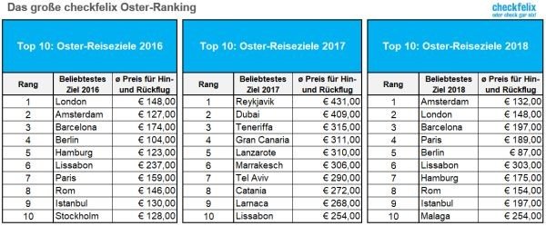Die Daten der Analyse zeigen: Über das verlängerte Wochenende setzen Österreichs Reisende heuer vor allem auf Städtetrips innerhalb Europas. Erfreuten sich im Jahr 2017 noch weiter entfernte Ziele, wie Reykjavik, Dubai oder die Kanareninseln Teneriffa, Lanzarote und Gran Canaria großer Beliebtheit, belegen aktuell die Metropolen Amsterdam, London und Barcelona – wie auch 2016 – wieder die ersten drei Plätze der beliebtesten Osterreiseziele der Österreicher. Wer die freien Tage in diesem Jahr in Amsterdam verbringt, zahlt im Vergleich zum Vorjahr durchschnittlich 11 Prozent weniger für ein Flugticket.