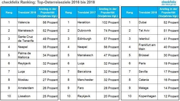 Suchten Österreichs Reisende in den beiden vergangenen Jahren mit Heraklion (+102 Prozent im Jahr 2017), Dubrovnik (+74 Prozent im Jahr 2017) und Valencia (+56 Prozent im Jahr 2016) vermehrt nach sonnigen Mittelmeerdestinationen, liegen 2018 vor allem Städtetrips im Trend. Mit Frankfurt am Main (+40 Prozent), Paris (+19 Prozent), Brüssel (+30 Prozent) und Kopenhagen (+12 Prozent) interessieren sich die Österreicher auch für mitteleuropäische Metropolen, die ideal über ein verlängertes Wochenende erkundet werden können.