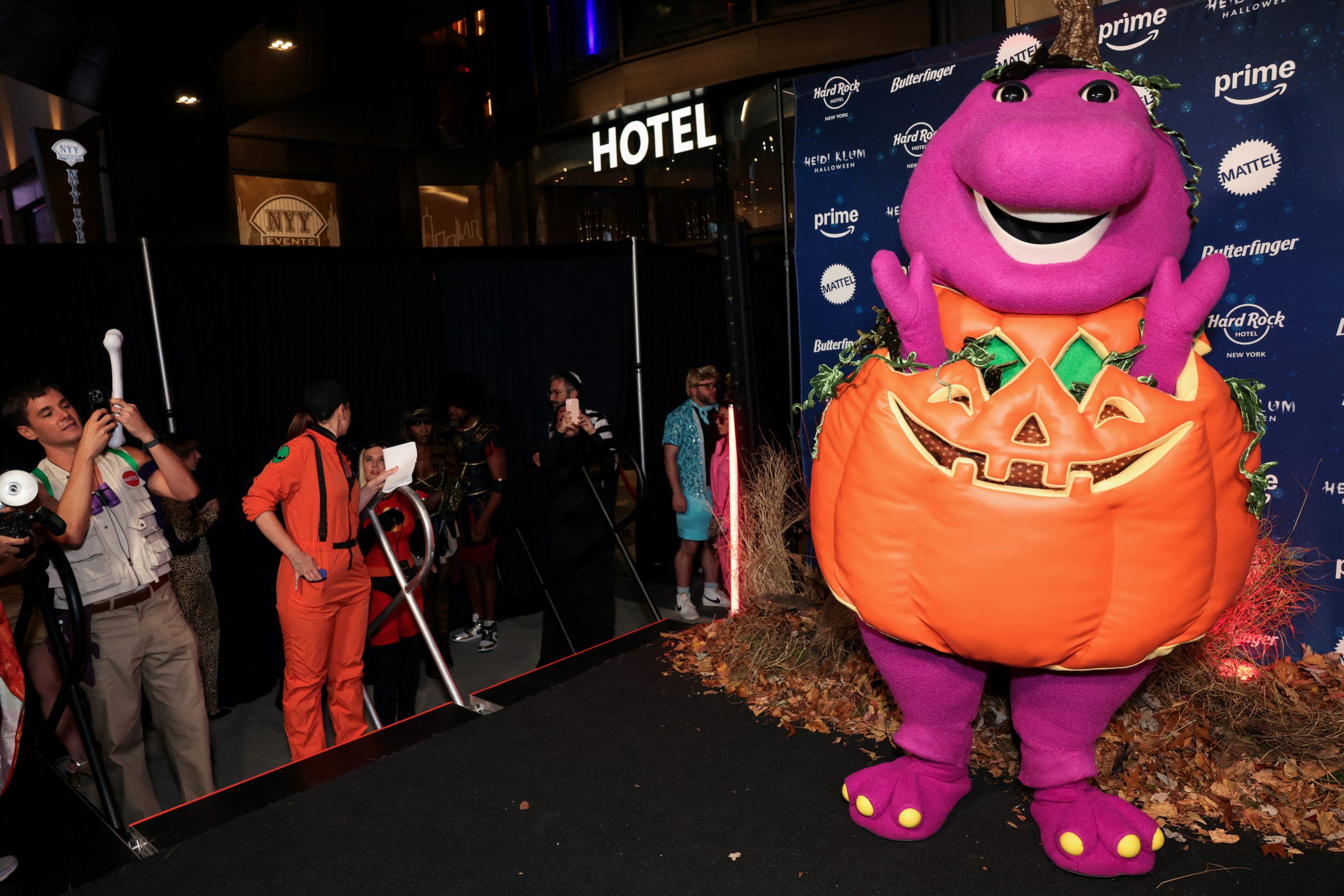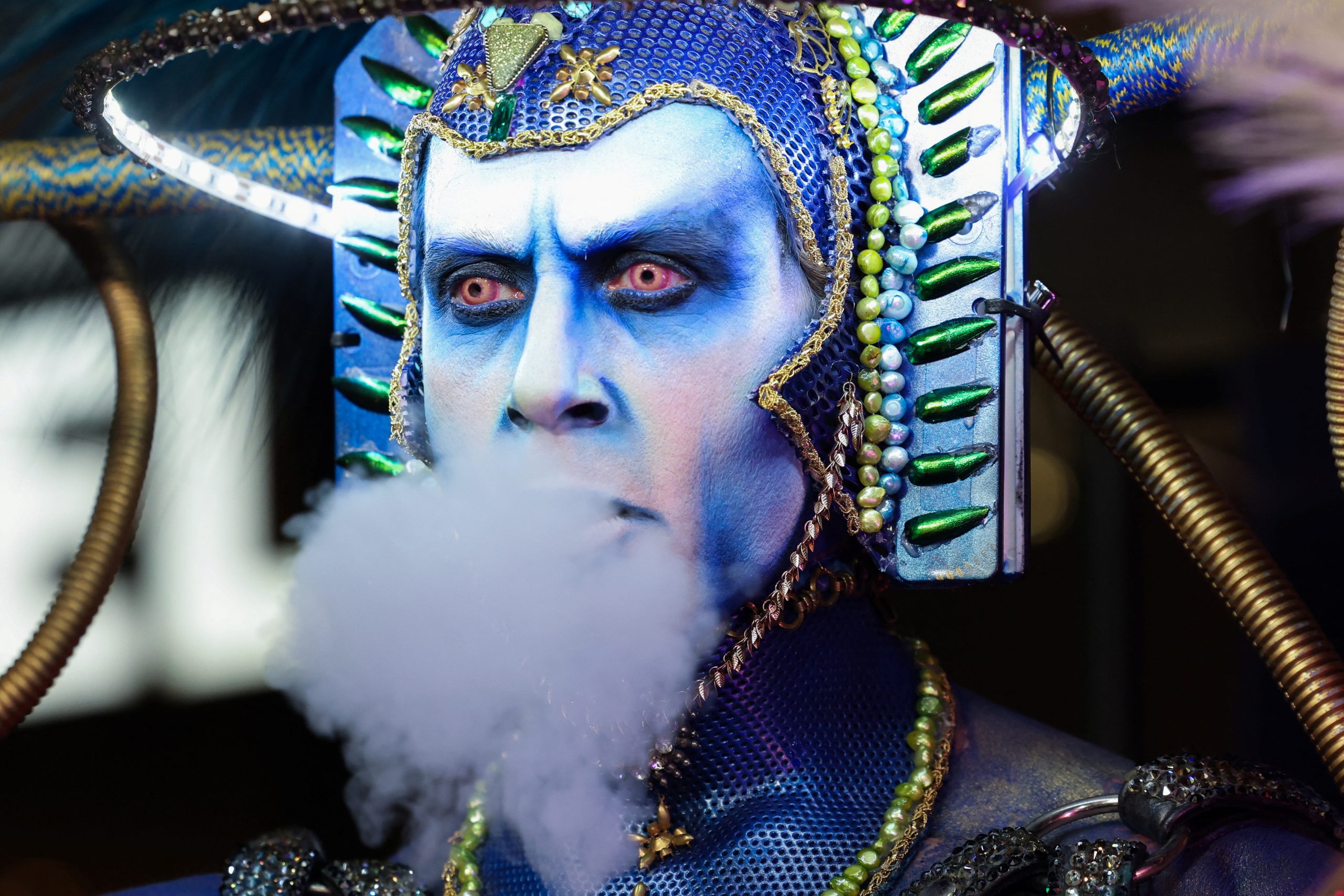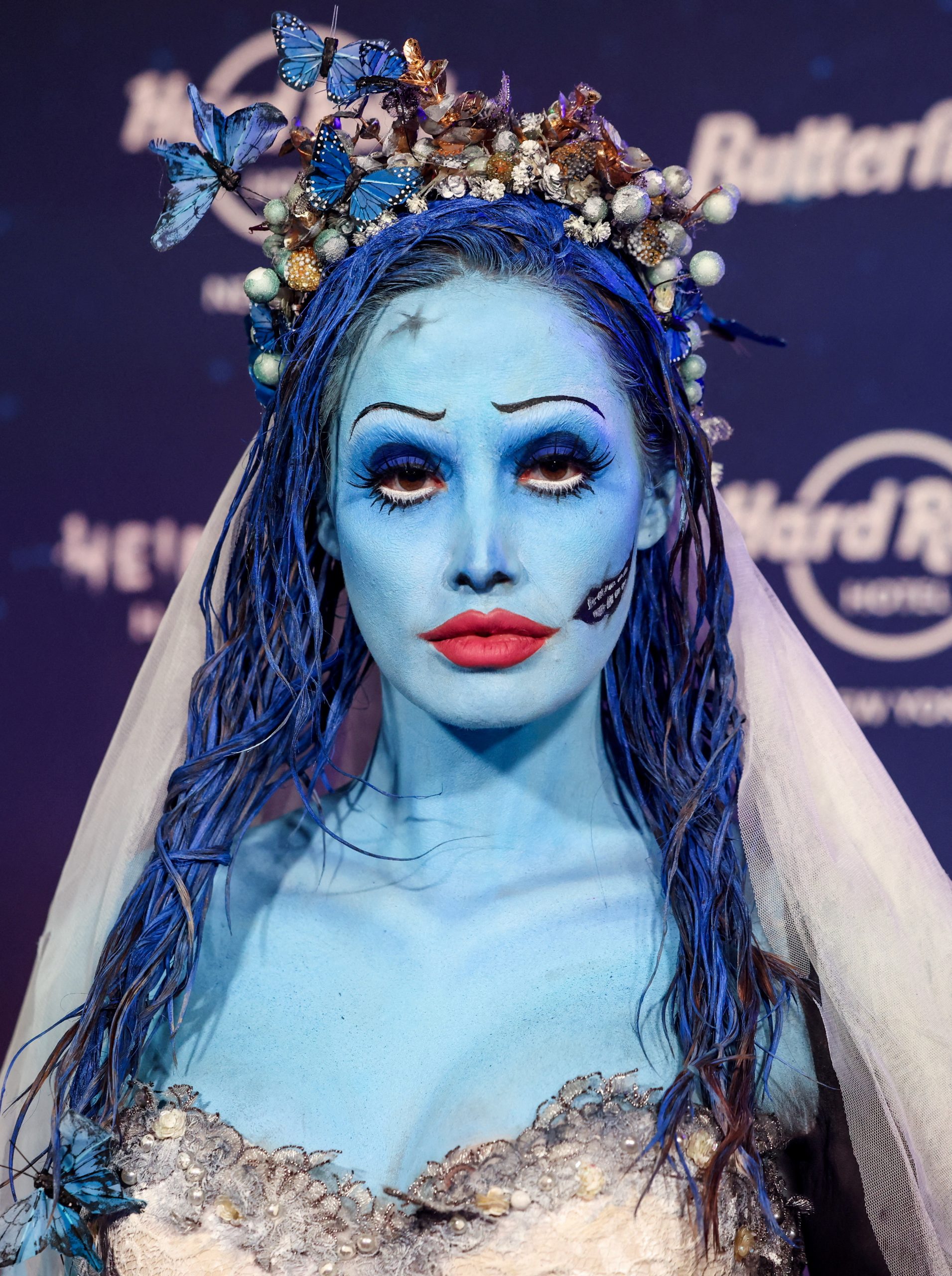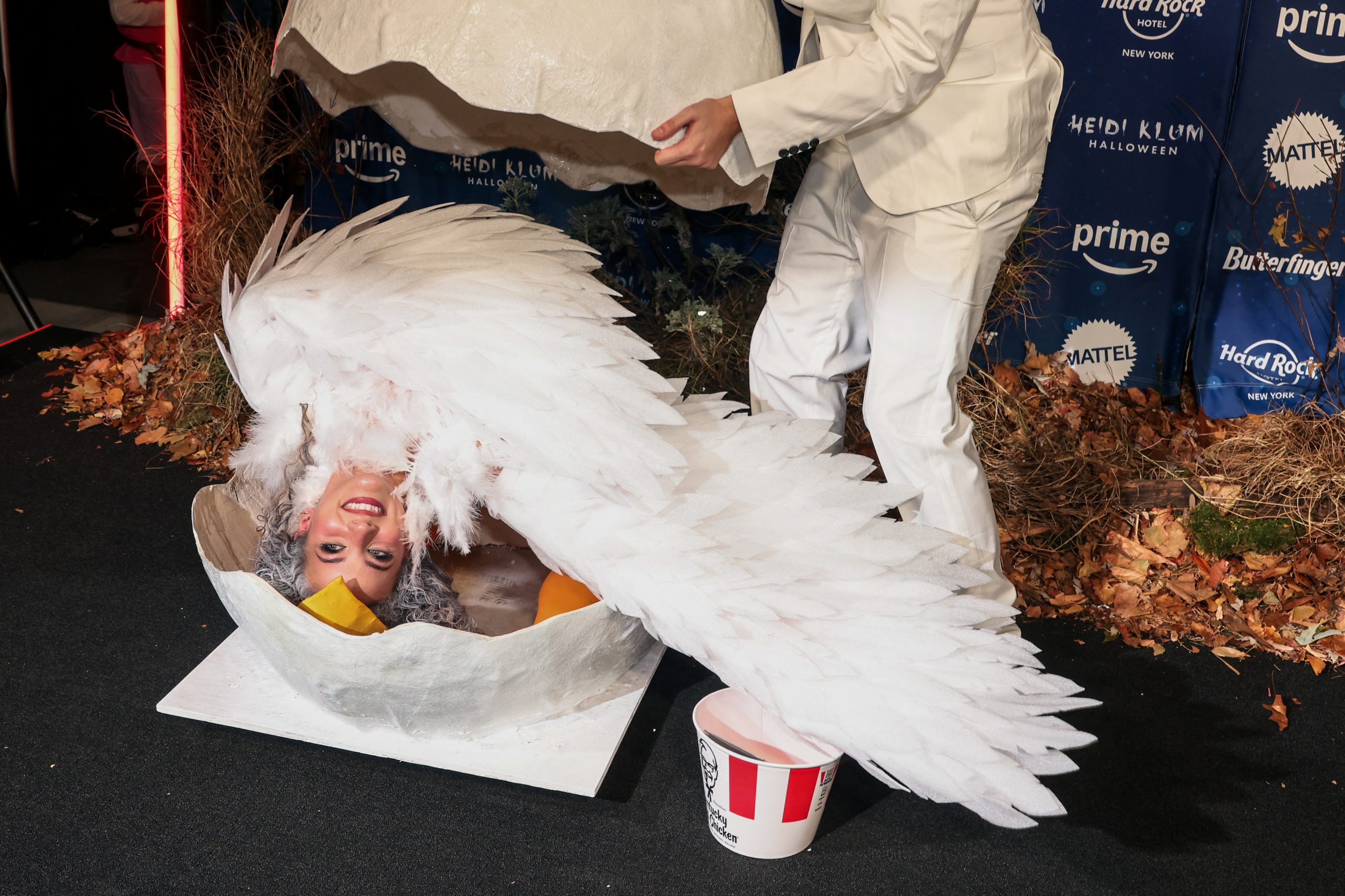 Dazu bedeckte faltige, gräuliche Haut den gesamten Kostüm-Körper der 51-Jährigen. Nur durch die Falten am Hals des Außerirdischen waren Klums Augen und Mund zu sehen. Die Bewegungen des riesigen Kopfes mit großen blauen Kulleraugen und beweglichem rosa Mund wurden nach Angaben der "New York Times", die Klum bei der Transformation begleitete, von einem Mitarbeiter ferngesteuert.