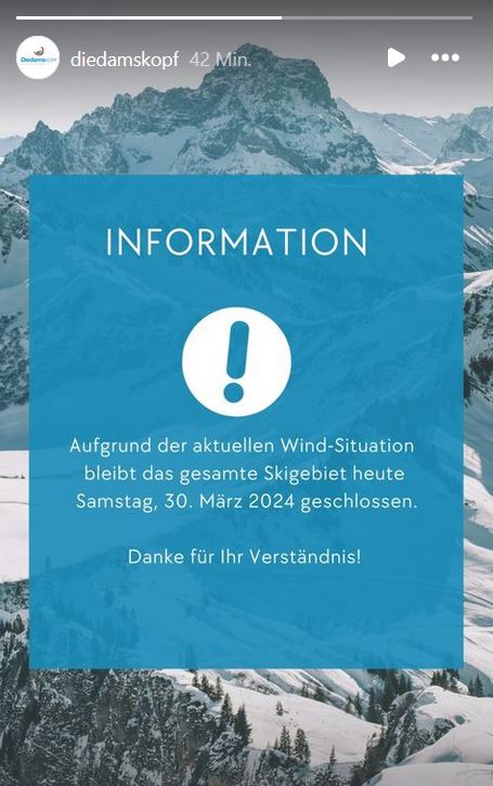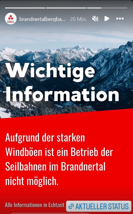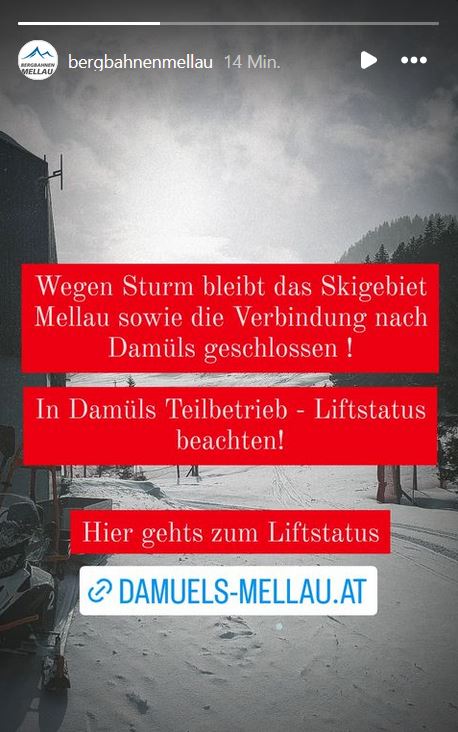 Einschränkungen in Damüls-Mellau: Im Skigebiet Mellau-Damüls kommt es auch heute zu erheblichen Einschränkungen. Der starke Wind führt zur Schließung der Verbindung zwischen Mellau und Damüls sowie der Lifte in Mellau. In Damüls ist nur ein Teilbetrieb möglich. Nähere Infos: https://www.damuels-mellau.at/