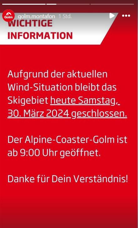 Golm bleibt geschlossen: Das Skigebiet Golm im Montafon wird den Liftbetrieb am heutigen Samstag wegen des Föhnsturms vollständig einstellen.