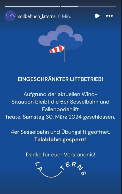 Eingeschränkter Betrieb in Laterns: In Laterns-Gapfohl ist die 4er-Sesselbahn und der Übungslift geöffnet. Die 6er-Sesselbahn und der Fallenbodenlift sind geschlossen.