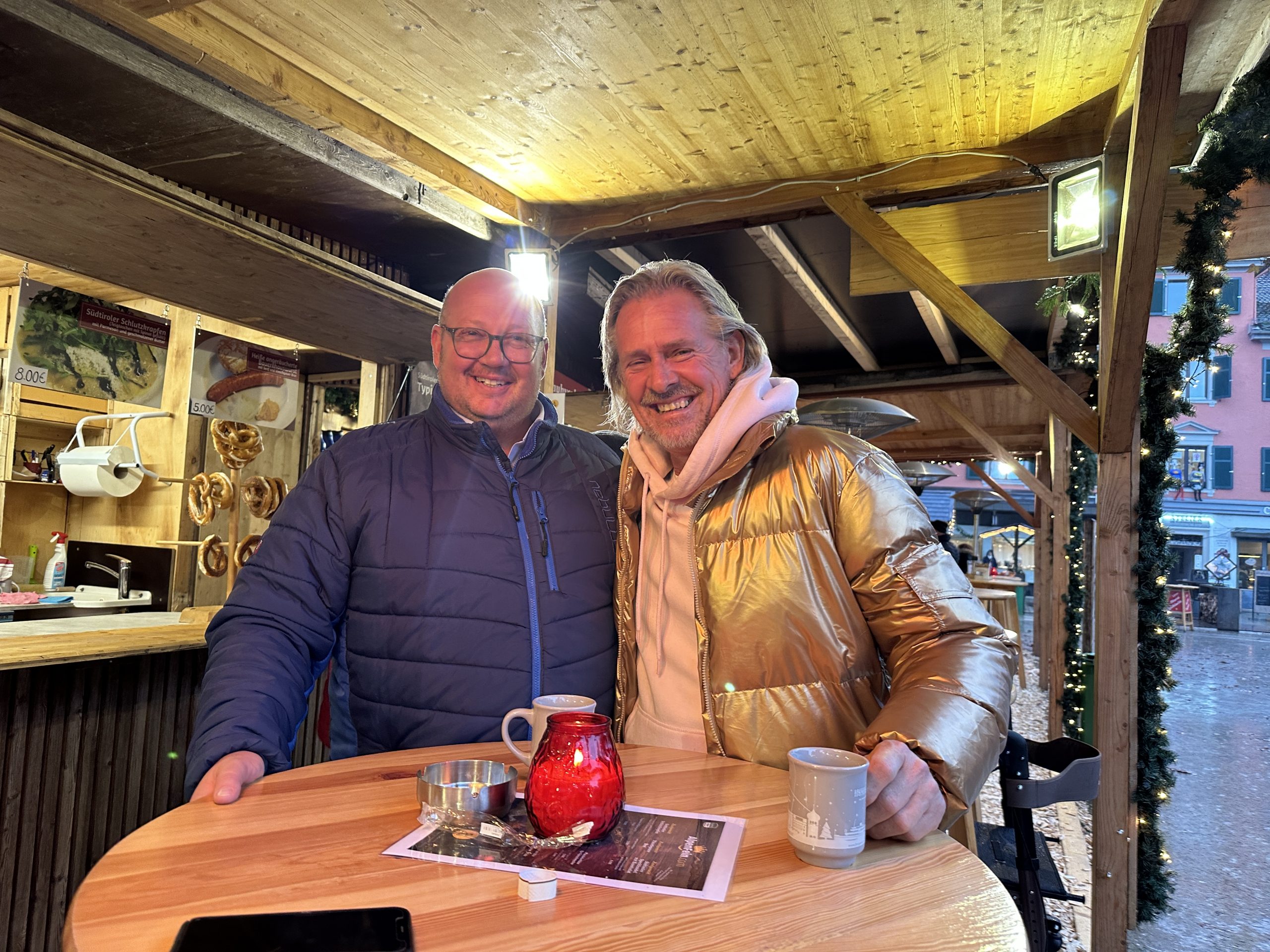 "Ich bin in Super-Stimmung", erklärt Rainer Kronfoth aus Lindau, der gerade mit Bekannten einen ersten Glühwein genoss. Vor allem, wenn man mit tollen Leuten den Weihnachtsmarkt besuche, habe man eine gute Stimmung, meint er und zeigt auf seine Begleiter. "Und das Wetter ist völlig wurst. Der Glühwein muss warm sein und optisch muss es schön sein", so Kronfoth. Dieser kostet heuer übrigens wieder 3,80 Euro, darauf einigte man sich mit Mehrheitsbeschluss. Das Wetter spreche zwar nicht dafür, verdeutlicht Matthias Gunsch aus Kennelbach, aber es mache Spaß, gesellig unter Leuten zu sein. "Hoffentlich gehts die nächste Zeit auch so schön weiter", sagt er. Er sei in totaler Weihnachtsstimmung, gab Kronfoth zu verstehen. "Ich liebe Weihnachten, ich brauche Weihnachten, mein Beruf hat mit Weihnachten zu tun." Er dekoriere den Weihnachtsmarkt mit, verrät er. Trotzdem sei er gerne als Gast am Markt. Er sei noch nicht in Weihnachtsstimmung, meint hingegen sein Kumpel. Dieser spazierte nach der Arbeit auf den Markt: "Das kommt spätestens dann, wenn meine Frau sagt: Jetzt müssen wir Weihnachtsgeschenkle für die Kinder kaufen gehen", so Gunsch. Noch genieße er die Vorweihnachtszeit und einen abendlichen gemütlichen Glühwein.