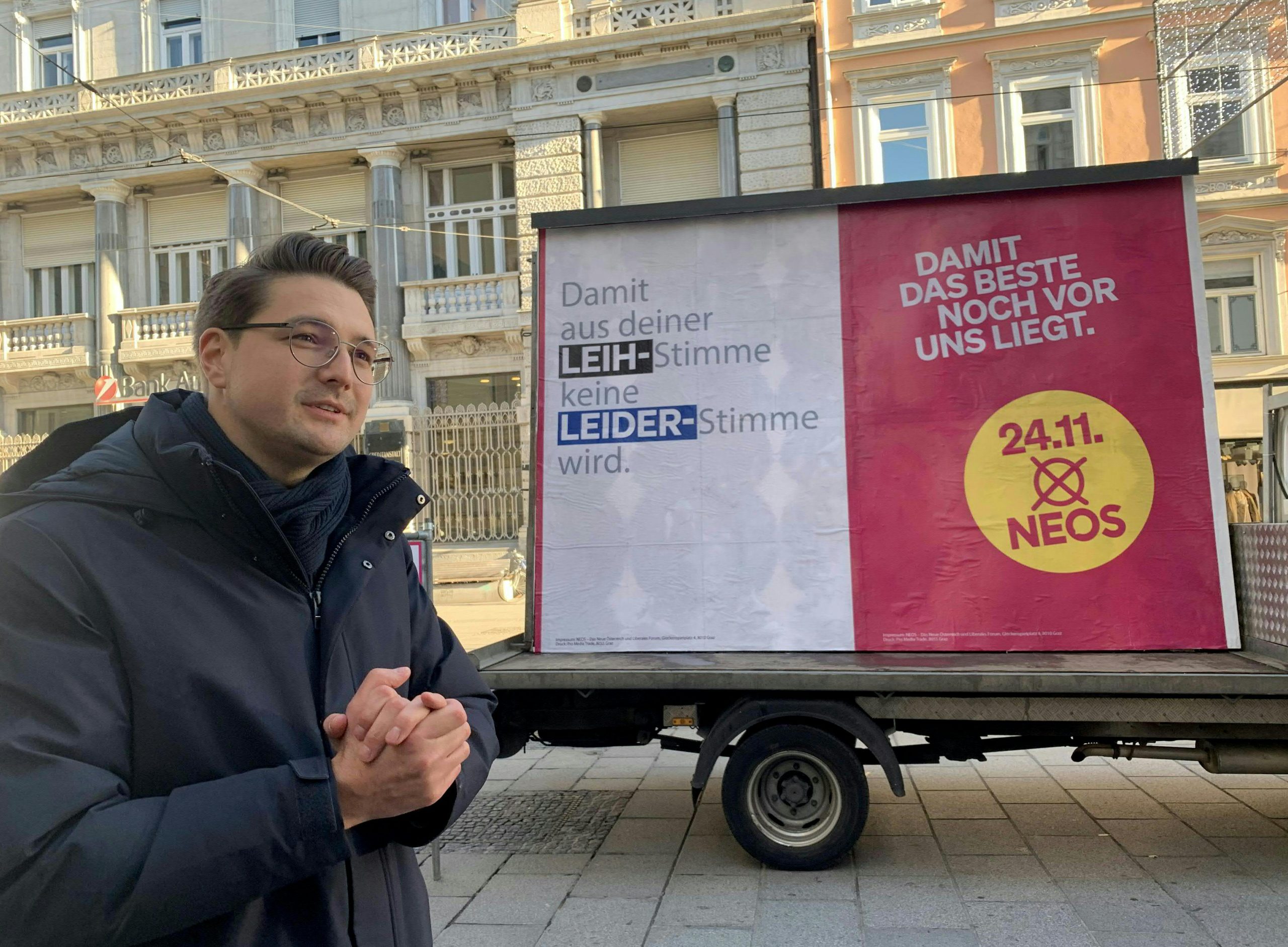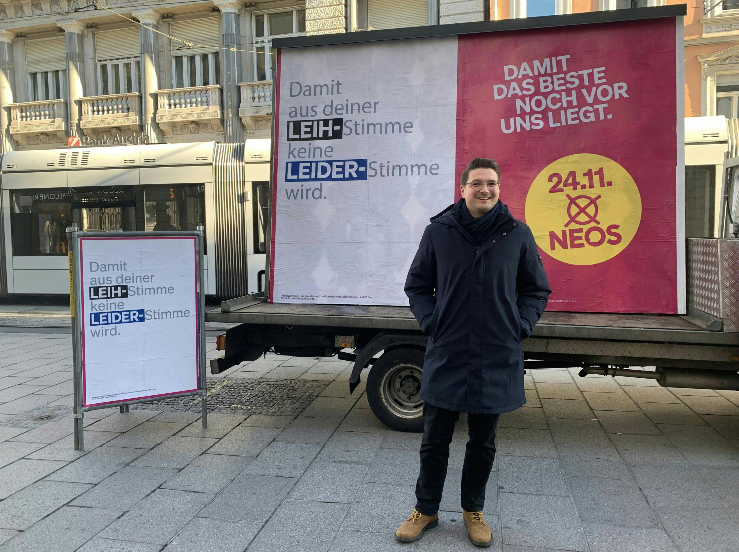Drexler hatte schon nach der Nationalratswahl um die Stimmen der Wähler für die Volkspartei gebeten - auch wenn sie ihm diese nur "leihen" würden. NEOS werben stattdessen für sich und plakatieren: "Damit aus deiner LEIH-Stimme keine LEIDER-Stimme wird".