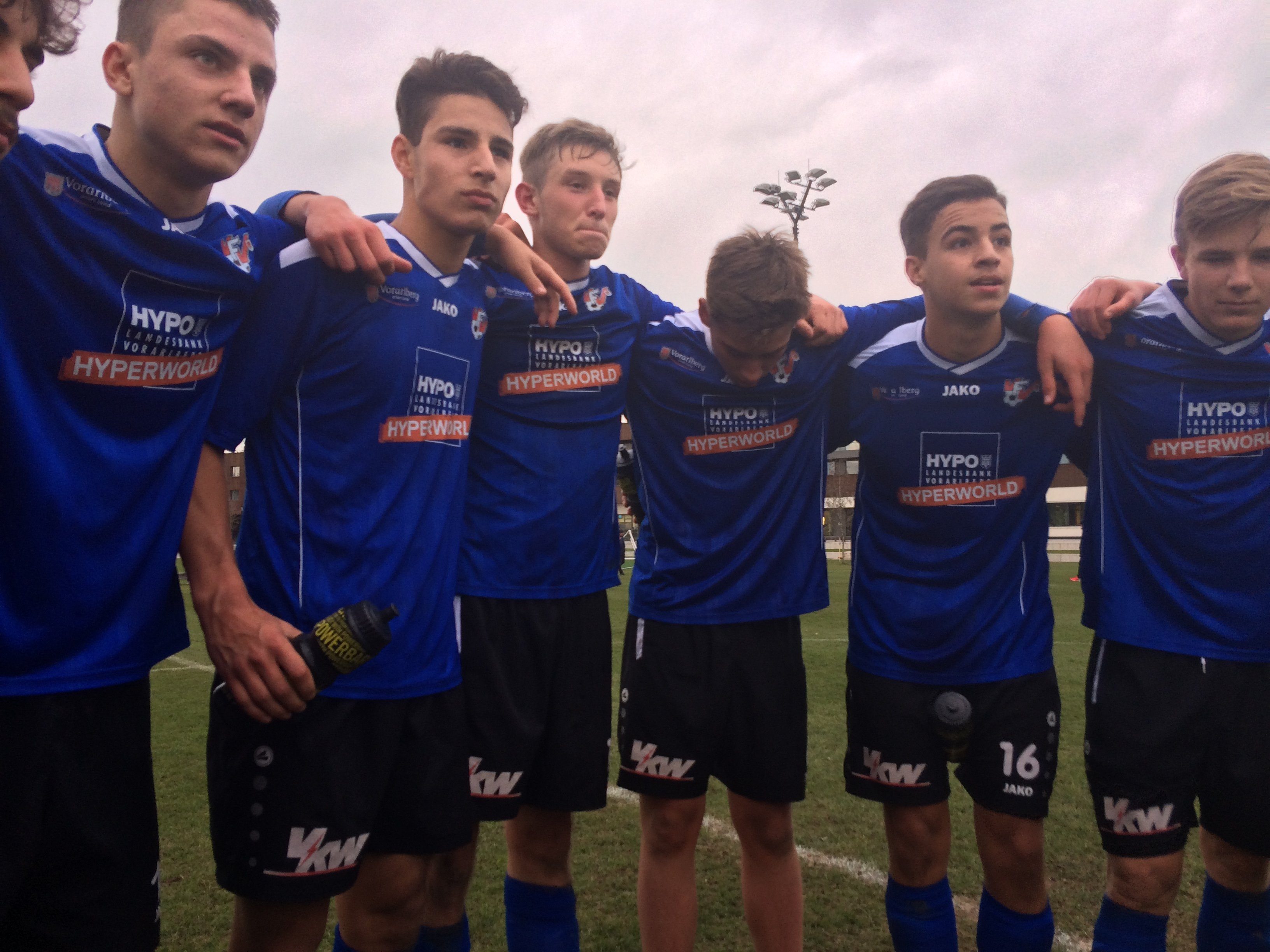 Nach dem sensationellen 3:1-Heimsieg gegen Austria Wien vor geraumer Zeit hat die Unter-16-Mannschaft mit Trainer Dieter Alge nun auch auswärts für Furore gesorgt. Die Vorarlberger Talente besiegten die Alterskollegen vom Starensemble von RB Salzburg mit 2:0 und rückten in der Tabelle von Rang neun auf den siebenten Tabellenplatz vor. Der Dornbirner Amir Abdijanovic brachte die Alge-Schützlinge kurz vor der Pause mit seinem siebenten Treffer in dieser Saison überraschend in Front (35.). Der Tisner Maximilian Kreiner sorgte mit dem zweiten Tor kurz vor dem Abpfiff für die ganz große Sensation aus Ländle-Sicht. Damit fügten die Vorarlberger den Mozartstädtern die erste Niederlage in dieser Meisterschaft zu, Salzburg kassierte erst sechs Gegentreffer und nun zwei Treffer gegen Vorarlberg. Für das heimische Nachwuchszentrum sicher eine Sternstunde in der langen Geschichte. Der Feldkircher Emircan Yildiz hielt seinen Kasten rein.