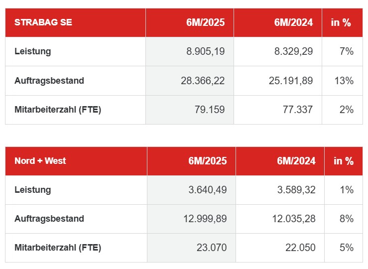 Der Auftragsbestand wurde vor allem durch Akquisitionen im Bahnbau, in der Energieinfrastruktur sowie bei Hightech-Bauten und Forschungsprojekten gestützt. Australien steuerte per Ende Juni 2025 rund 660 Mio. Euro bei. Beim Personalstand verzeichnete der Konzern ein leichtes Plus: Mit durchschnittlich 79.159 Beschäftigten (FTE) waren um 2 Prozent mehr Menschen bei der Strabag tätig als ein Jahr zuvor.
