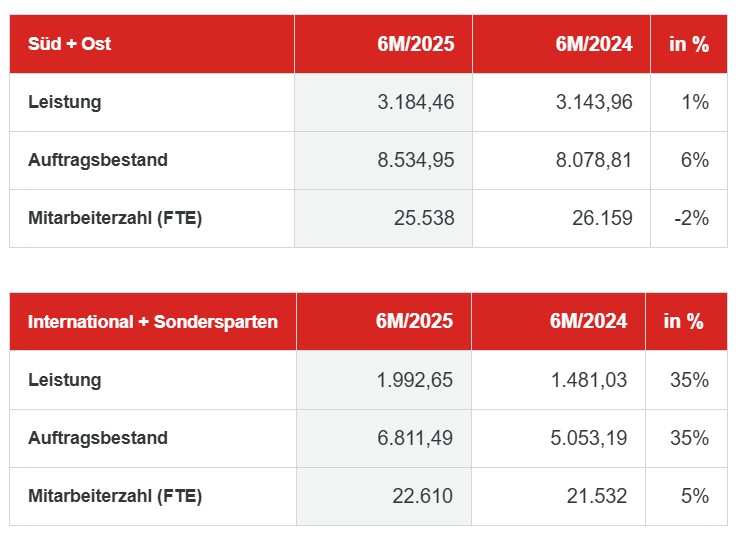 Der börsennotierte Baukonzern Strabag hat im ersten Halbjahr 2025 kräftig zugelegt. Die Bauleistung erhöhte sich um 7 Prozent auf 8,9 Mrd. Euro, der Auftragsbestand lag Ende Juni bei 28,4 Mrd. Euro – ein Plus von 13 Prozent gegenüber dem Vorjahr. Das Ergebnis vor Zinsen und Steuern (EBIT) kletterte um 58 Prozent auf 129,4 Mio. Euro. Unter dem Strich blieb ein Konzernergebnis von 94,9 Mio. Euro – um 4 Prozent mehr als im Vorjahreszeitraum.
