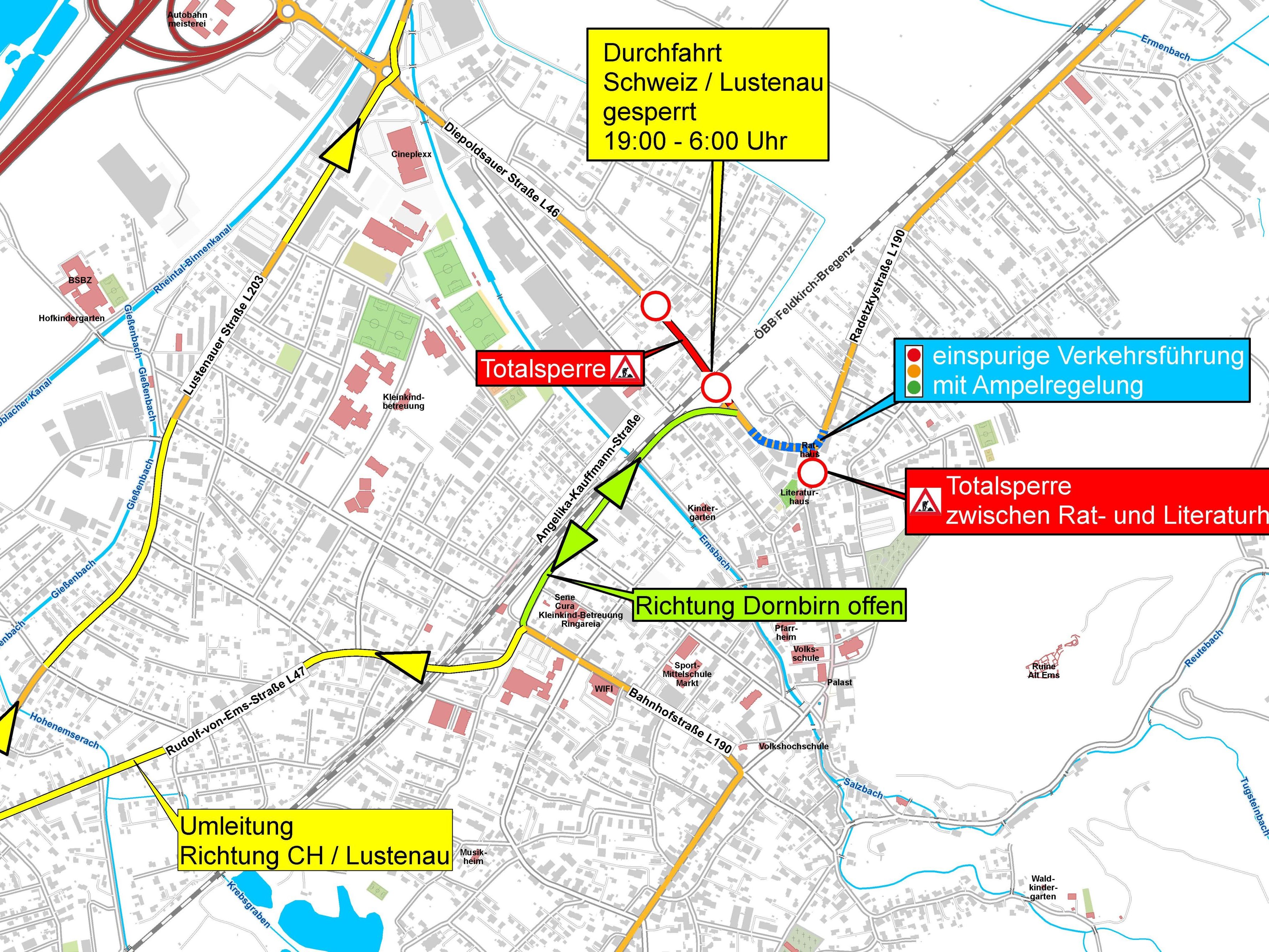 - Der Verkehr Richtung Grenze bzw. Lustenau wird über die Angelika-Kauffmann-Straße, Rudolf-von-Ems Straße und die Lustenauer Straße umgeleitet.