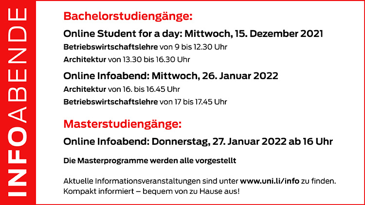 Hier gilt ebenso, bei der digitalen Tour über den Campus kann man zwar keine Uniluft schnuppern, einen hervorragenden ersten Eindruck gewinnt man dennoch – und Zeit für die Beantwortung individueller Fragen bleibt auch. Die nächsten Termine an der Universität Liechtenstein findet ihr hier.