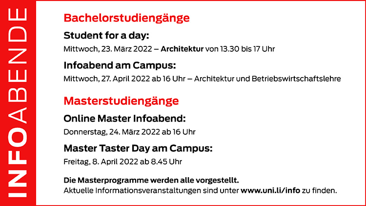 Beim «Student for a day» Architektur an der Universität Liechtenstein erfahren interessierte Schülerinnen und Schüler, wie Architekten Häuser oder Städte entwerfen. Sie erhalten die Gelegenheit, in einem Kurzprojekt selbst an Architekturentwürfen zu tüfteln. Bei einem Campus-Rundgang lernen sie Studierende kennen und erfahren im persönlichen Gespräch Interessantes über berufliche Perspektiven.